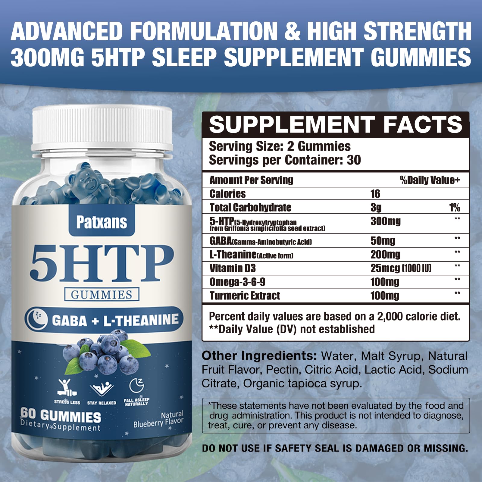 - [Why Choose Patxans]]: Each Patxans 5HTP gummy contains 300mg 5-HTP extract, 50mg GABA extract, 200mg l-theanine, 25mcg vitamin D3, 100mg omega-3-6-9, 100mg turmeric extract are an easy to take gummies suitable for women, men, adult.