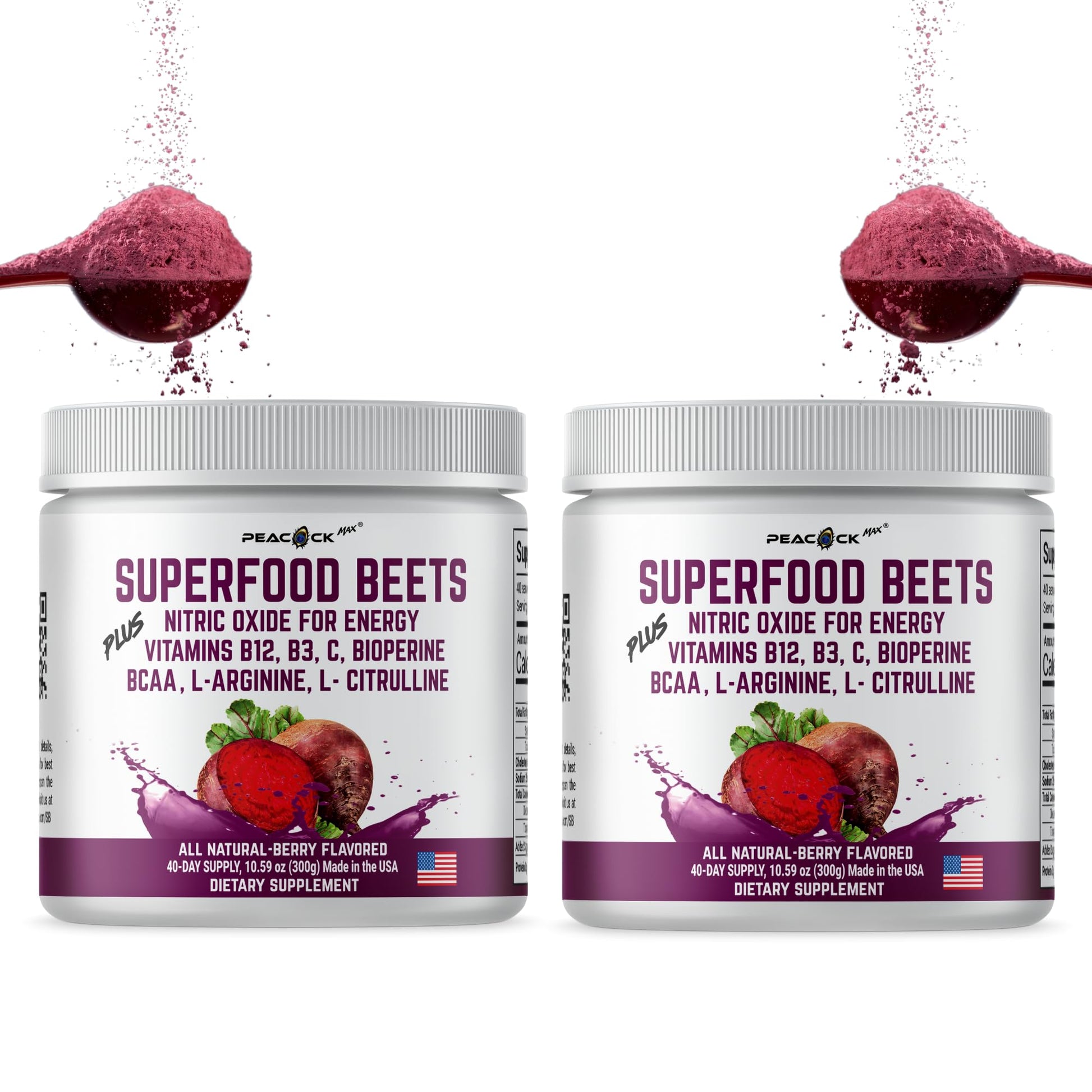 Peacock Max Beet Root Powder, 10.59 oz, Pack of 2 - Berry Flavor Nitric Oxide Booster Superfood with Green Tea Extract, BCAA, L-Arginine, L-Citrulline for Heart Health & Circulation Support, Non-GMO