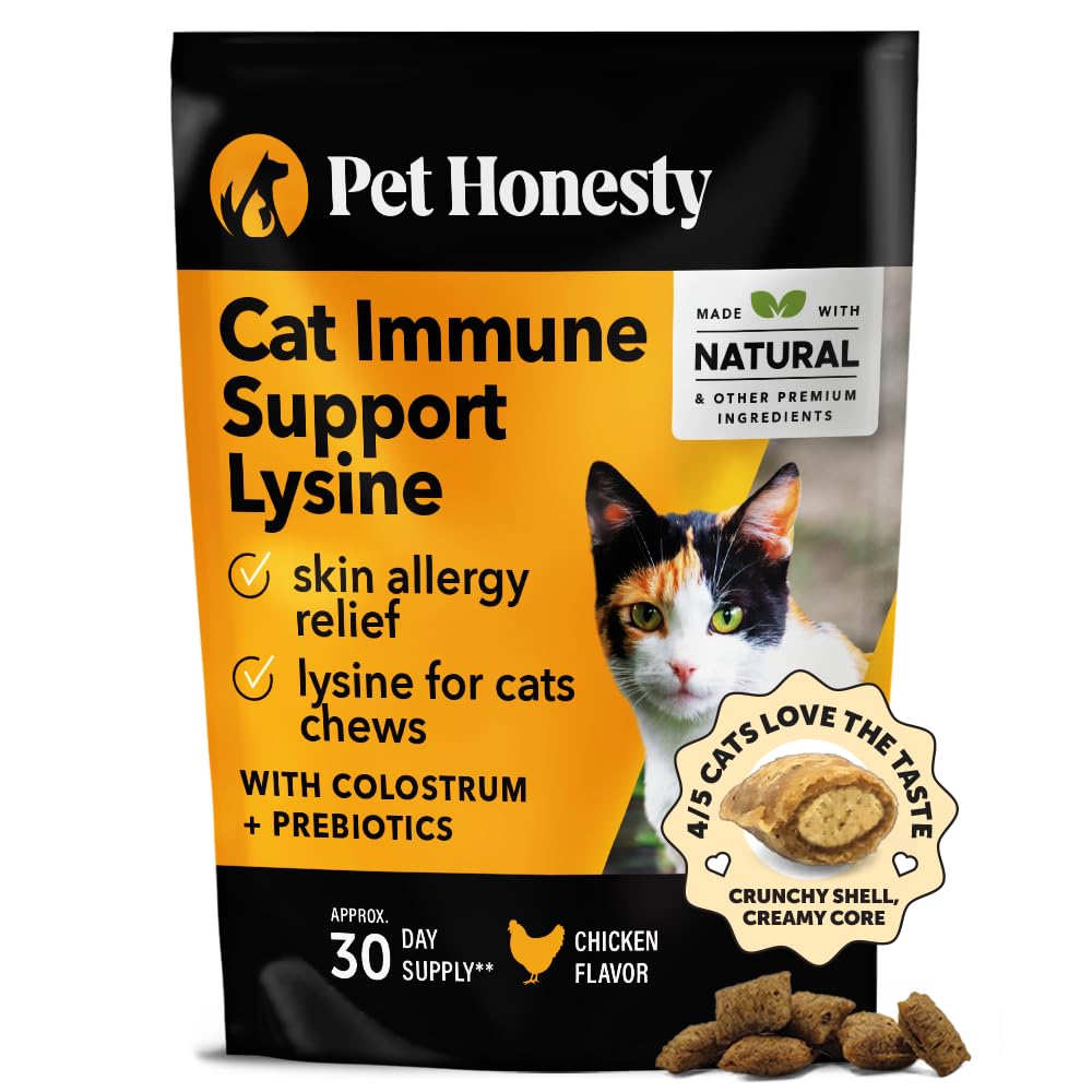 - A Texture and Taste Cats Love: Pet Honesty’s Immune Health Lysine is a delicious supplement that contains amino acids, prebiotics, antioxidants, and more to support your cat’s immune and respiratory health. Powerful, wholesome ingredients are packed inside a unique texture format: crunchy on the outside and creamy on the inside, offering a taste and texture combination that cats love.
