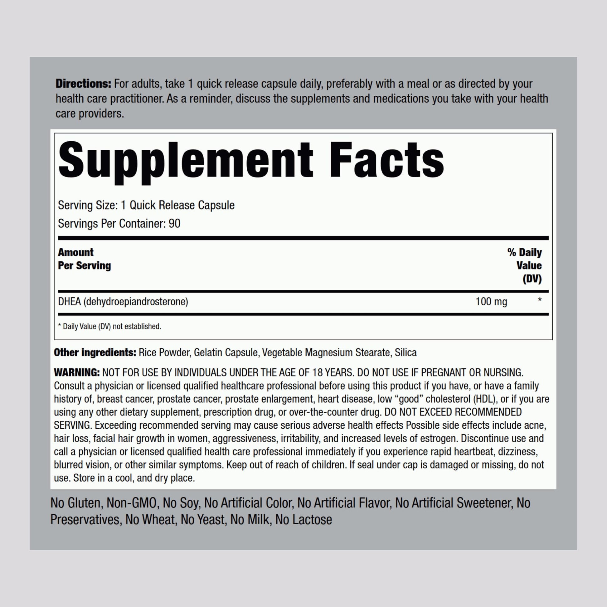 Piping Rock DHEA for Women and Men 100mg | 90 Capsules | Dehydroepiandrosterone Supplement | Non-GMO, Gluten Free