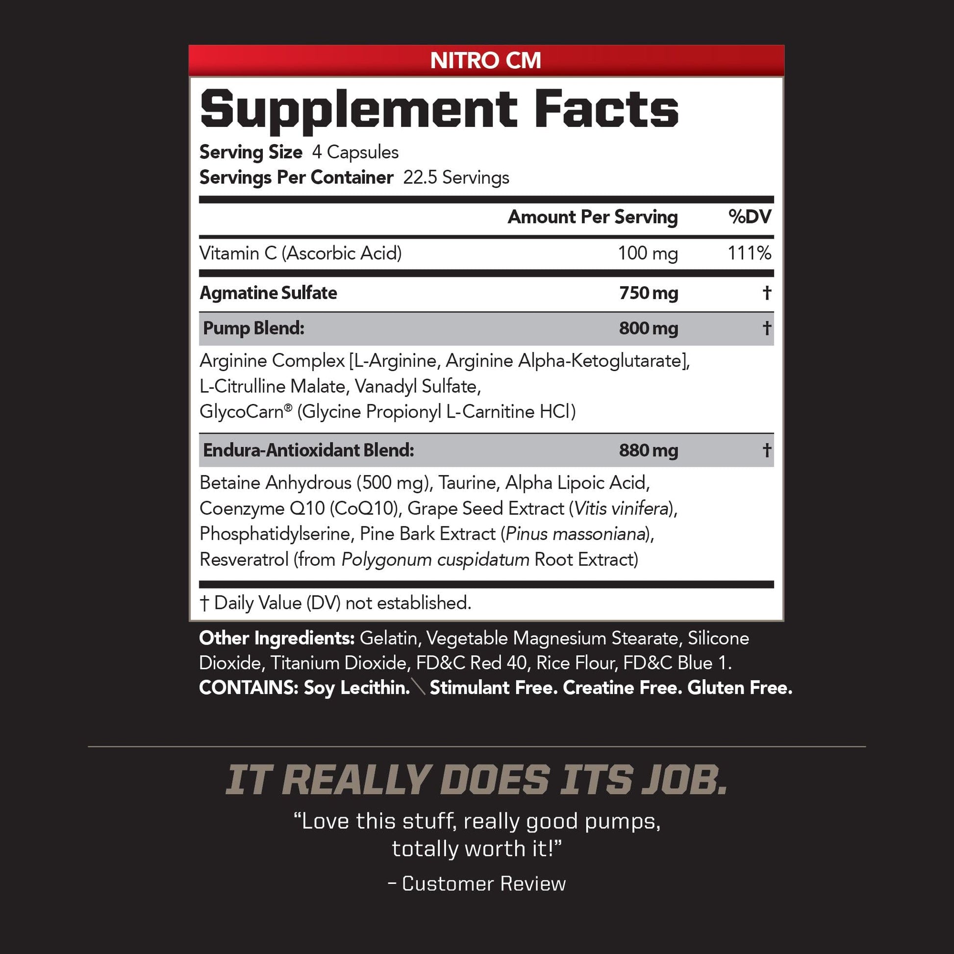 - Intense Muscle Pumps: The clinically studied dose of Agmatine Sulfate in NITRO CM gets absorbed into your system quicker and more effectively than use of Arginine alone. Agmatine allows you to feel the fullness, hardness, and muscle pump effects more readily, and it helps give NITRO CM its edge in supporting stronger performance and better muscular output.