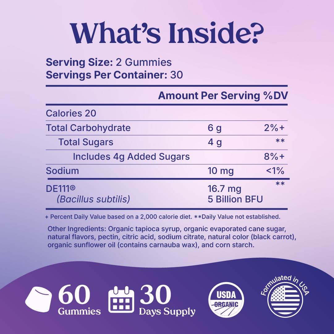 - Support your gut health with our organic probiotic gummies, delivering 5 billion CFU of powerful probiotic per serving. These science-backed probiotic enzymes help maintain digestive balance and support regular, comfortable bowel movements.