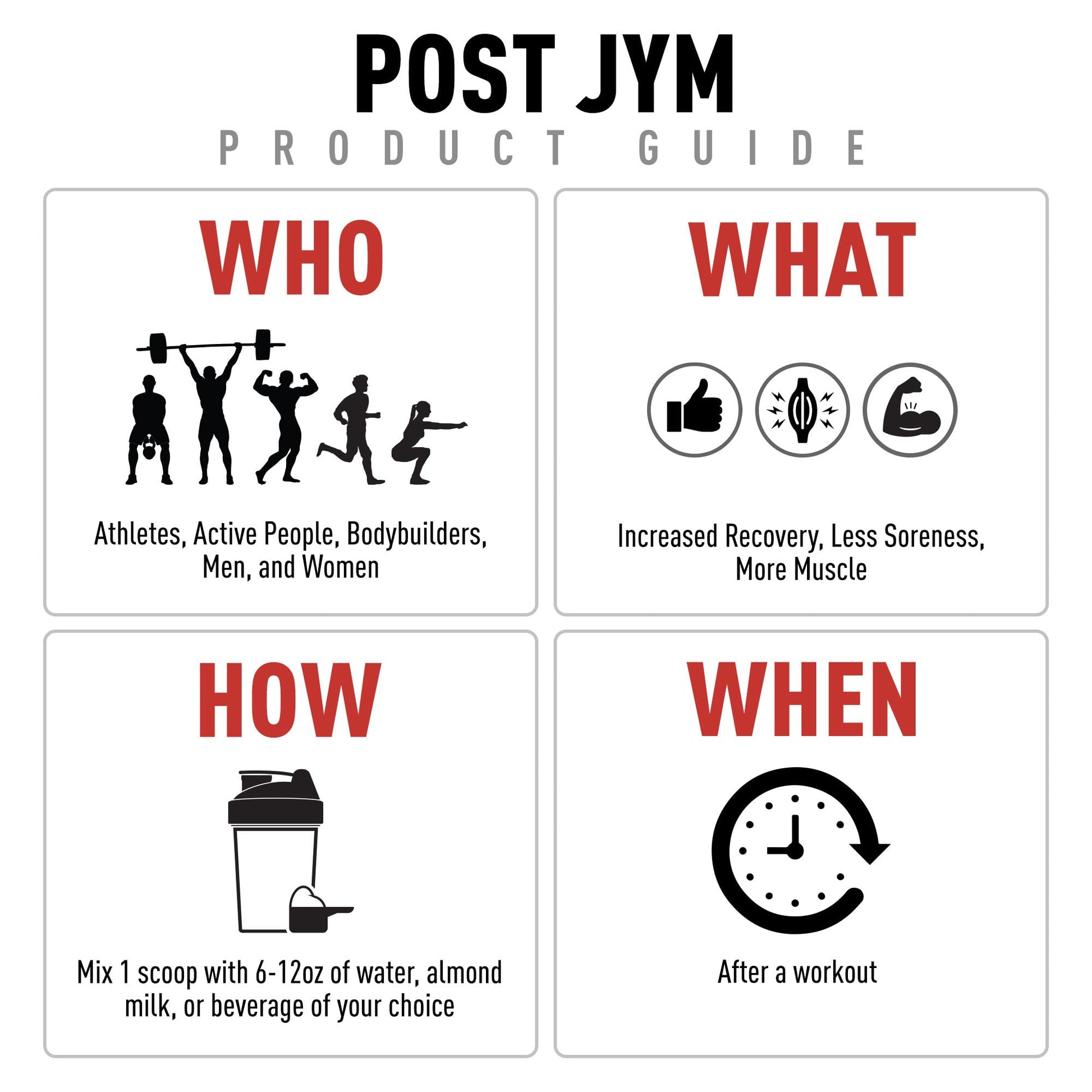 - VERSATILE USE - This postworkout powder is best for both men and for women. As with all JYM products, Post JYM contains no proprietary blends or abbreviated formulas.