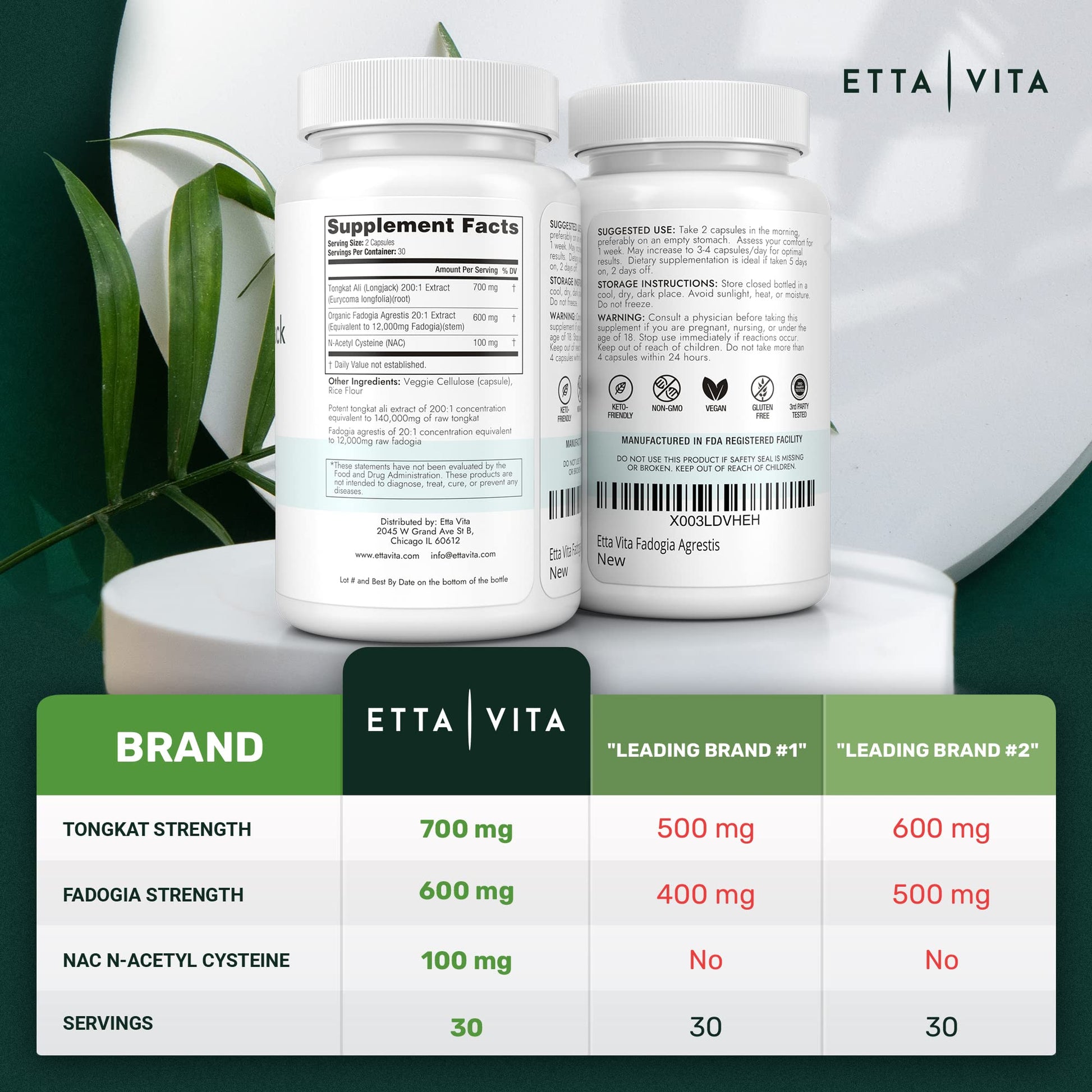 - [2x Purity - Fadogia Agrestis 20:1]: Etta Vita's tongat-ali 700mg with fadogia agrestis 600mg supplement is carefully formulated to support overall well-being and vitality. While the market standard is 1:1 - 10:1, ours is 20:1, lending more impact on hormonal balance stimulation.