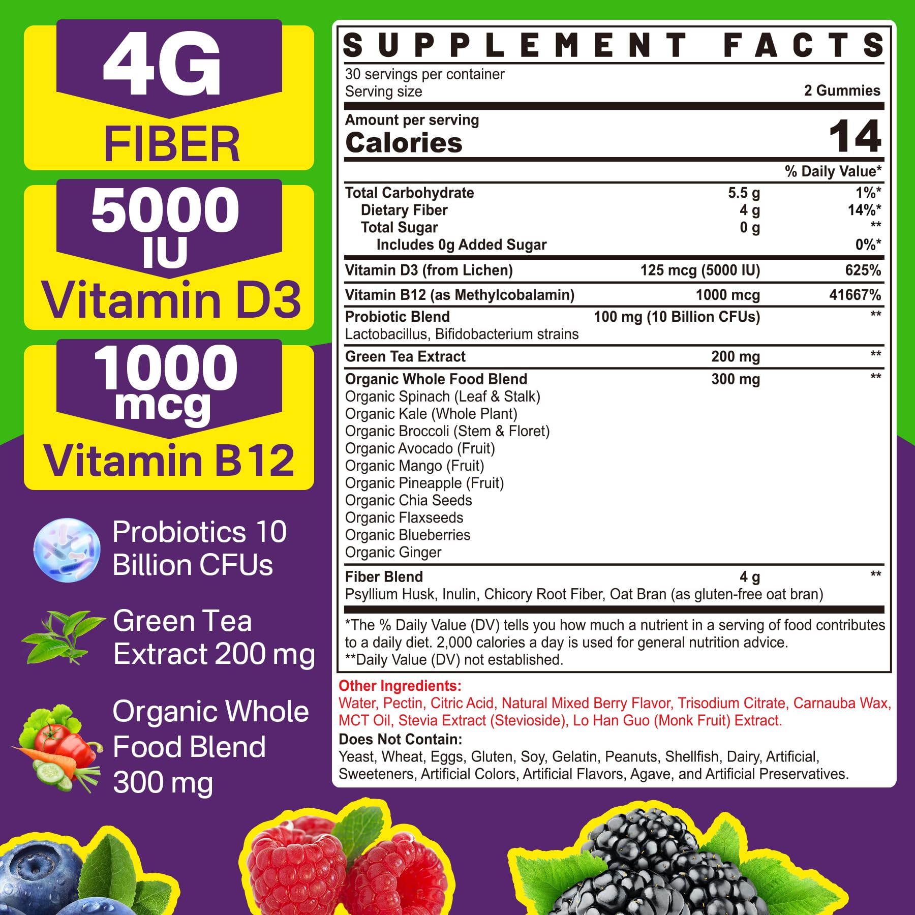 - [Enhance Fulfill, Don't Worry Calorie Intake]: Support your fulfill and energy with our fiber vitamin gummies, featuring 1000mcg of vitamin B12 and 5000iu of vitamin D3. Designed to promote fulfill, these low-calorie gummies help reduce calorie intake while keeping you energized. The added daily fiber and organic whole food blend may keeps you feeling full, and easier to say goodbye to high-calorie foods. Enjoy now the benefits of a balanced diet with enhanced energy and reduce cravings!