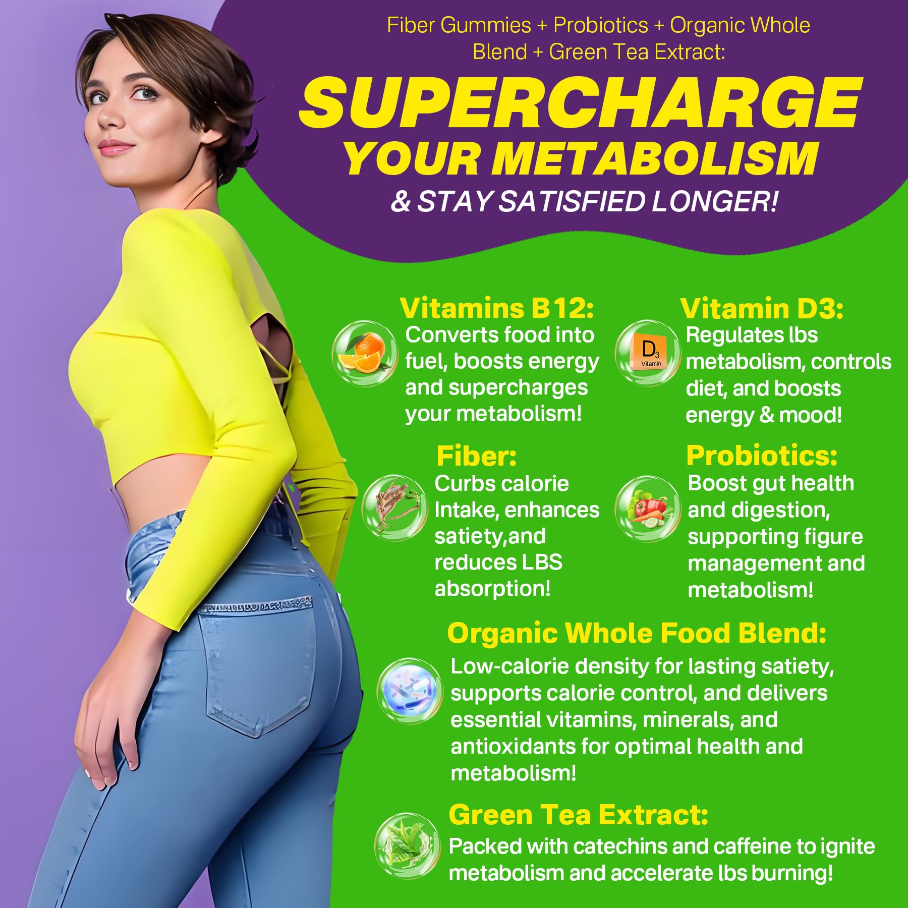 - [Enjoy Healthy Met-bolism]: Our Fiber Vitamin Gummies are uniquely formulated to boost metabolic. Unlike other brands, we combine green tea extract with a nutrient-rich organic whole food blend to help burn excess nutrients and boost antioxidant levels. Additionally, our probiotics optimize gut health. Prebiotic and probiotic fibers enhance digestion and nutrient absorption, while vitamins B12, D3 help you stay energized every day. Enjoy the present with our fiber gummies designed for adults.