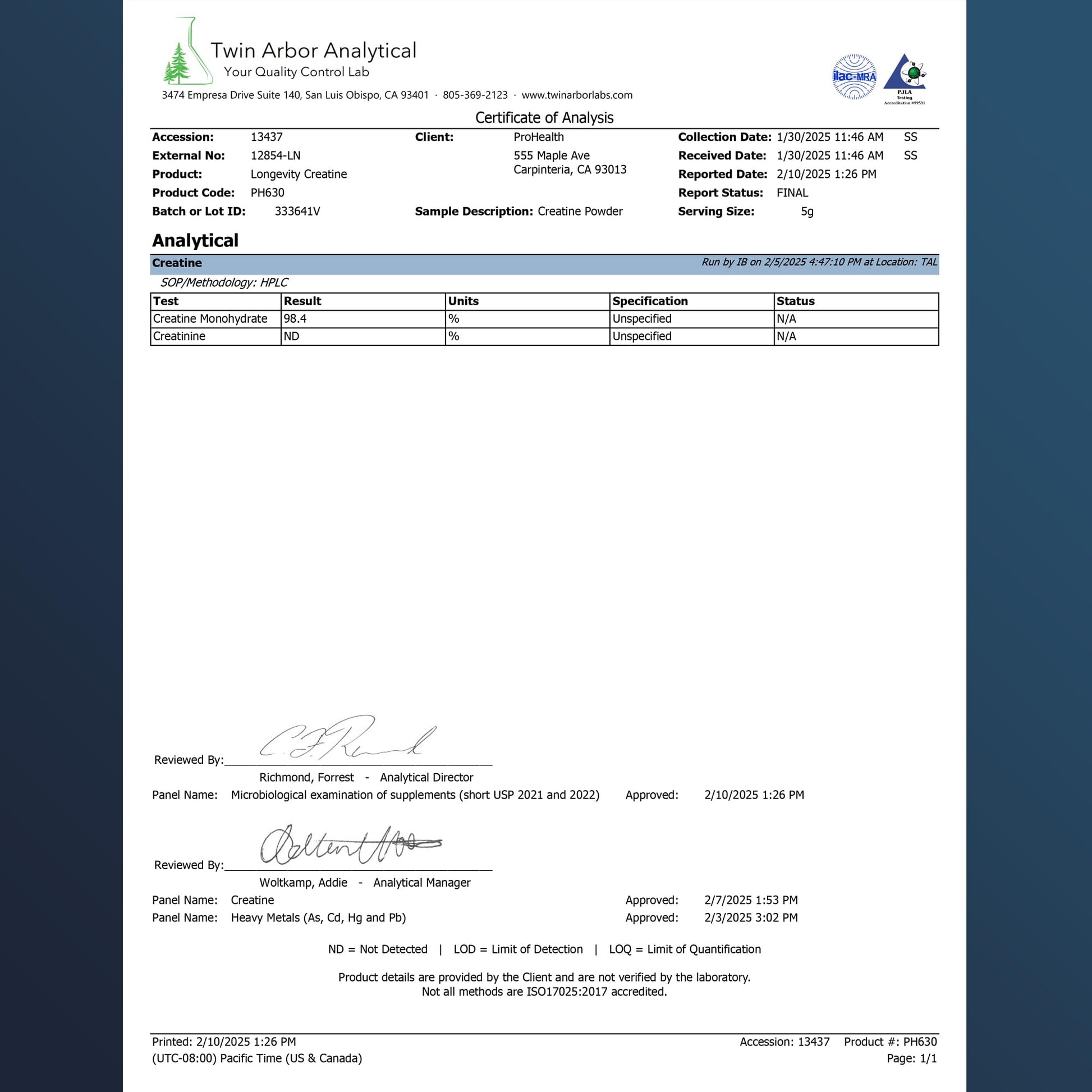 - ULTRA-HIGH QUALITY: 3rd-party lab tested. Certified free of contaminants, heavy metals, fillers, toxins and byproducts. Compared to other products our creatine is made in a GMP-certified facility and guaranteed free from residue or contamination for optimal nutrient absorption and utilization in your body to support your health and longevity goals.