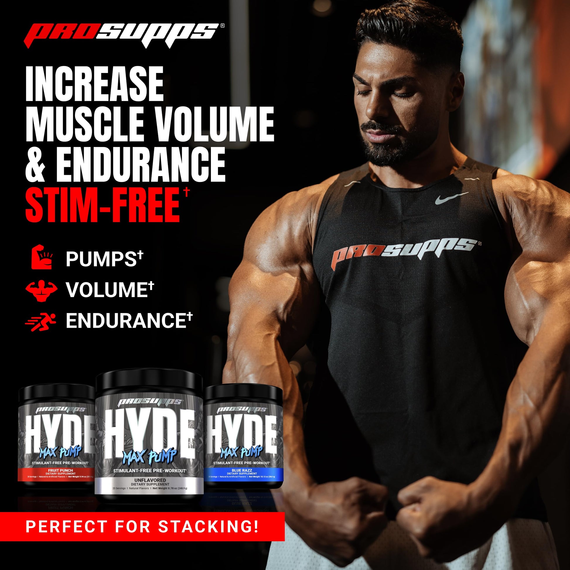 PROSUPPS Hyde Max Pump Pre Workout for Men and Women - Nitric Oxide Supplement for Pump and Endurance - Stimulant Free Pre Workout to Promote Blood Flow and Muscle Strength (Blue Razz, 20 Servings)