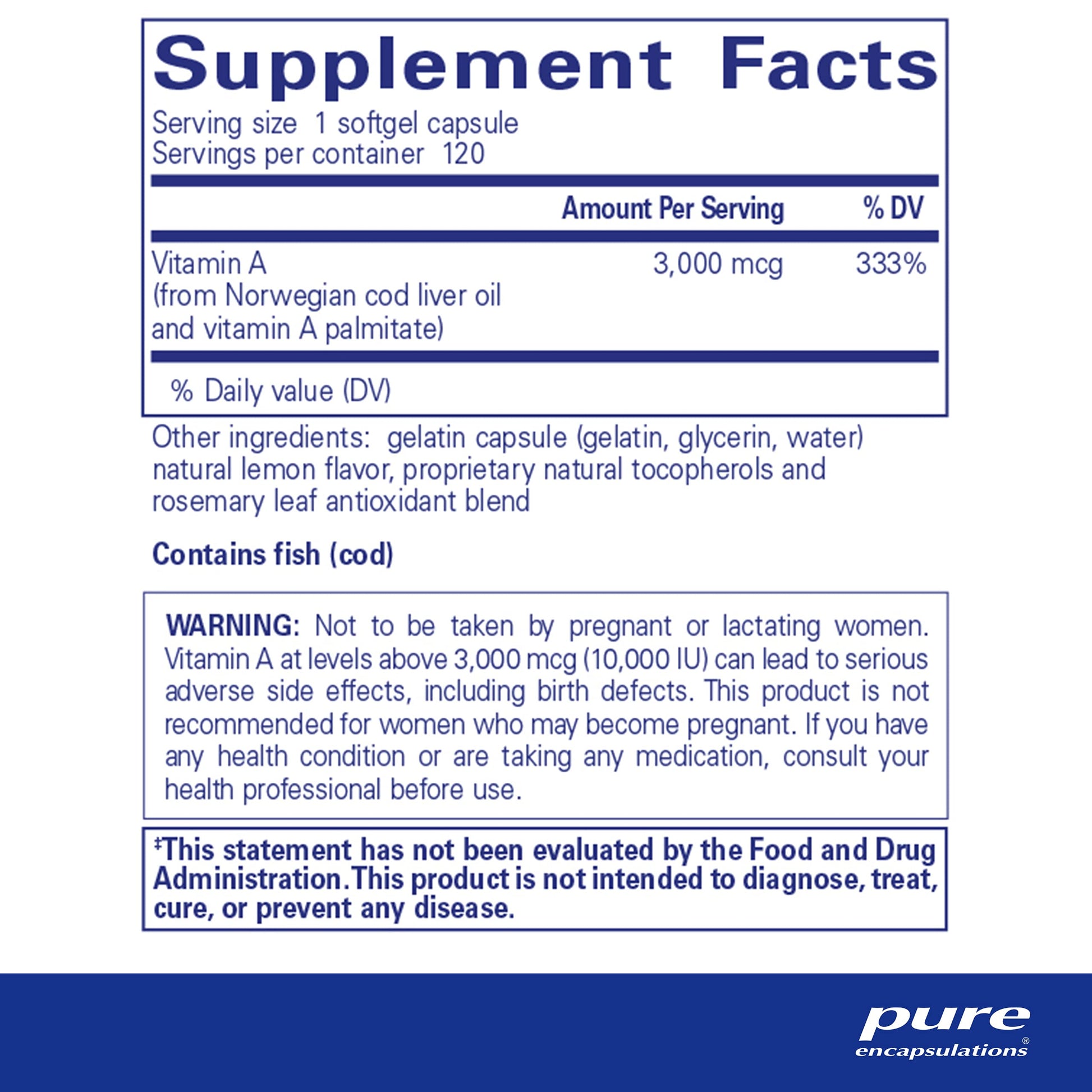 - Potent Vitamin A: Pure Encapsulations Vitamin A provides 3,000 mcg of vitamin A, sourced from Norwegian cod liver oil and palmitate, supporting cellular health, immune function, and healthy vision*