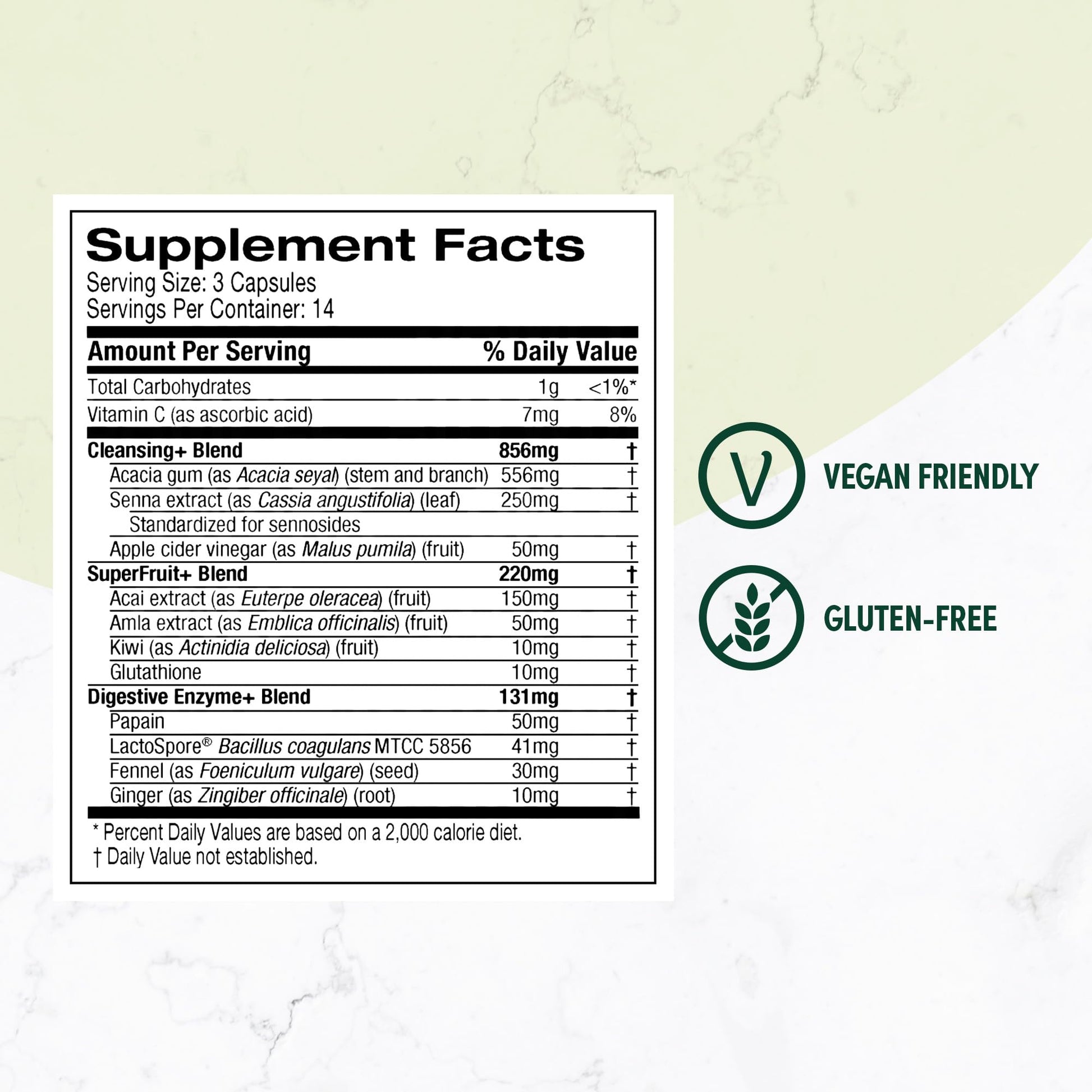 - Gentle Cleansing Formula: Features Senna, Apple Cider Vinegar, Active Probiotics, Digestive Enzymes, and a superfruit blend that includes Acai. Senna leaf extract works with your body’s natural elimination process to provide cleansing support.