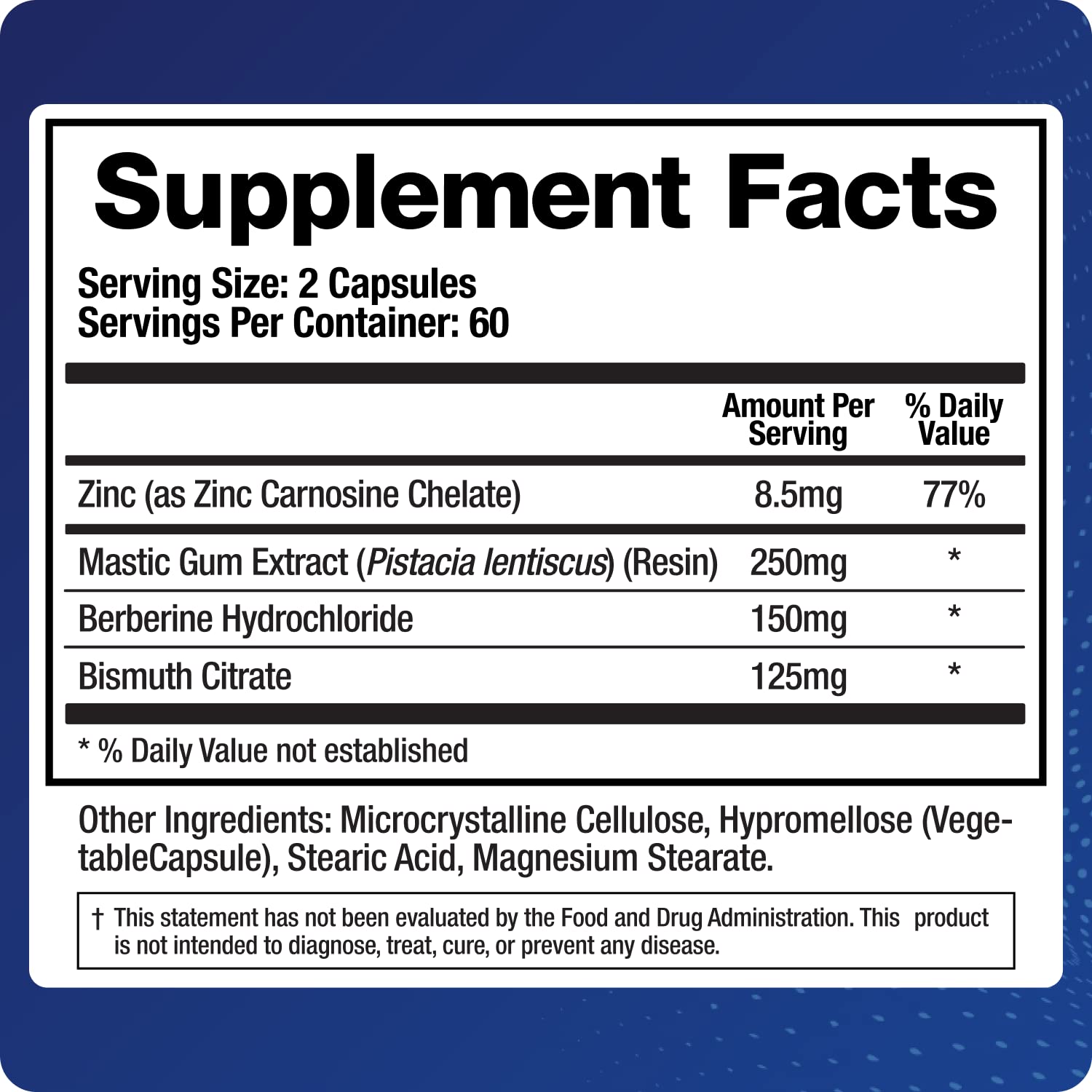 - ZINC CARNOSINE AND BERBERINE - Zinc carnosine is known for its potential to deter H. pylori and speed up tissue healing in gastric environments. Berberine sulfate is a botanical extract with protective properties and the ability to calm irritations.