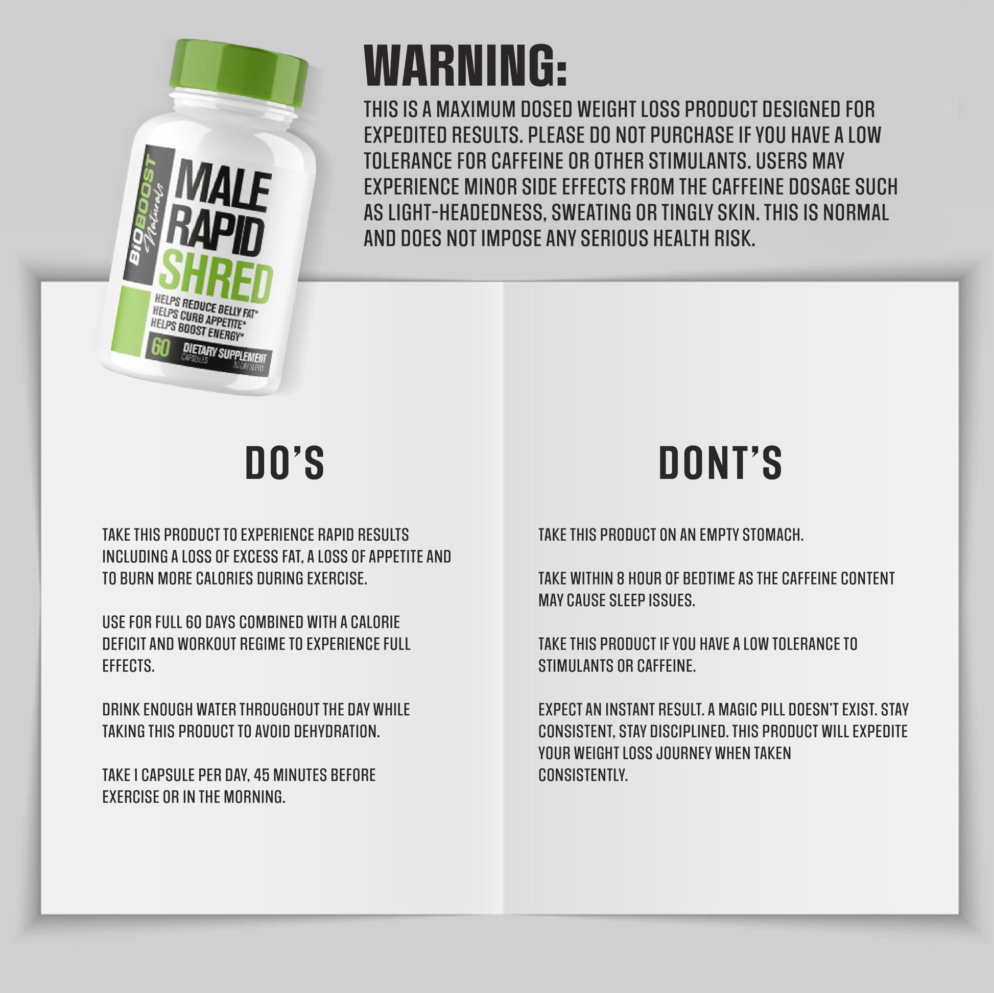 - 🏋️ Enhance Workouts and Athletic Performance: Male Rapid Shred isn’t just for fat loss-it’s also designed to amplify your physical performance. Ingredients like Green Coffee bean and Raspberry Ketone's work to increase endurance, stamina, and strength during workouts, giving you the power to push harder, recover faster, and achieve your fitness goals.