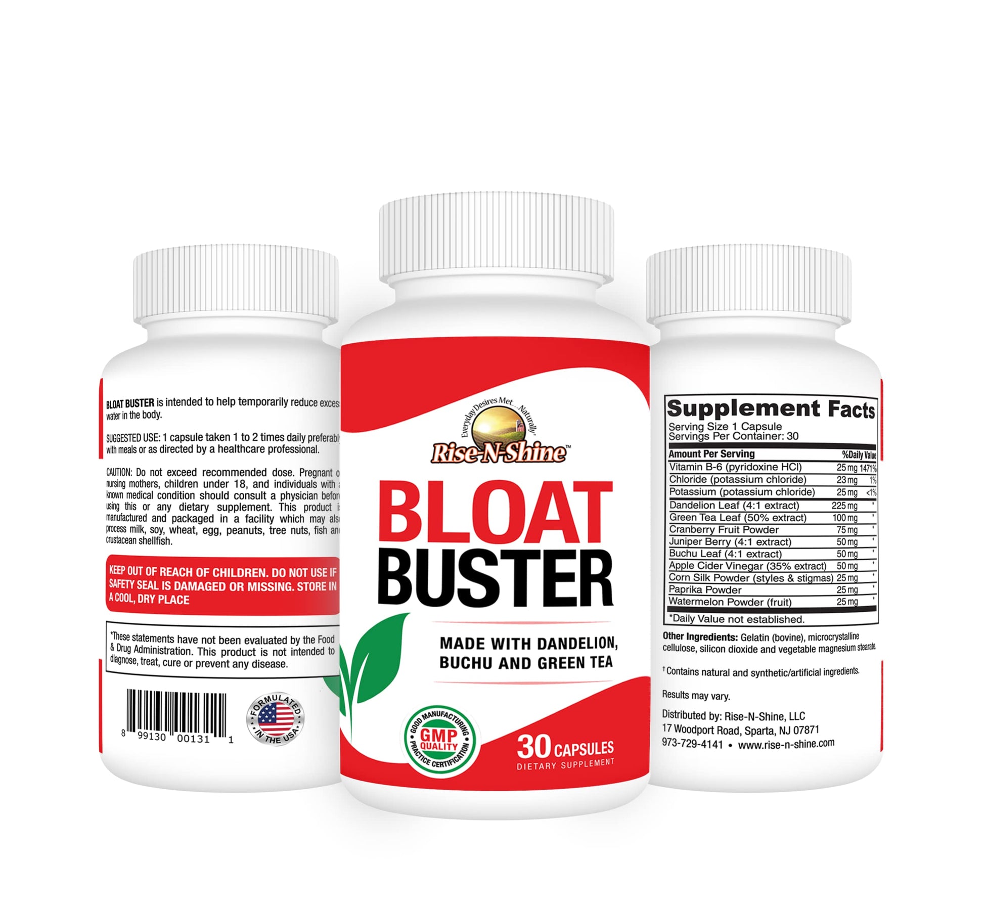 - Bloat Buster is made in the USA, with globally sourced ingredients, and manufactured in a GMP (Good Manufacturing Practices) facility. Supplements and Vitamins are an important part of a daily routine. Rise-N-Shine stands by all of its products, so you can try all of Rise-N-Shine vitamins and supplements with confidence. We never compromise on quality or service and stand behind every Rise-N-Shine product.*Rise-N-Shine products contain natural and synthetic/artificial ingredients.