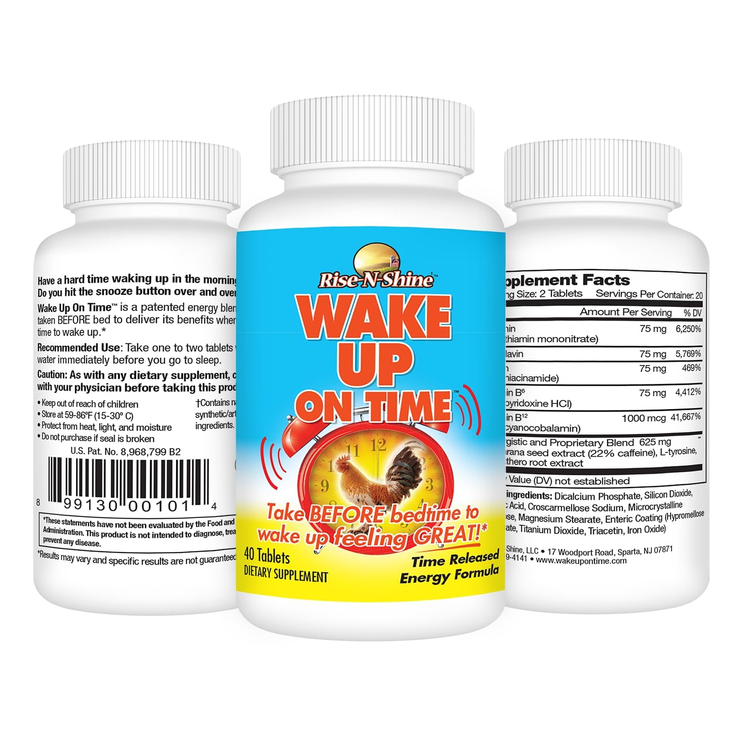 - Wake Up On Time by Rise-N-Shine includes Vitamin B6, Vitamin B12, 100 mg of Caffeine, L-Tyrosine, and Eleuthero Root extract. These ingredients work to support alertness and energy levels.