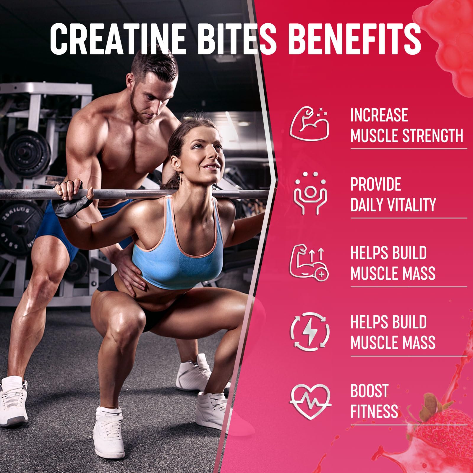 ROMYSE Creatine Bites - 5g Creatine Monohydrate Per Serving - Low Sugar and No Artificial Colors - Low Calorie - Strawberry Flavor - 60 Bites Gummy 30 Days Supply for Men Women