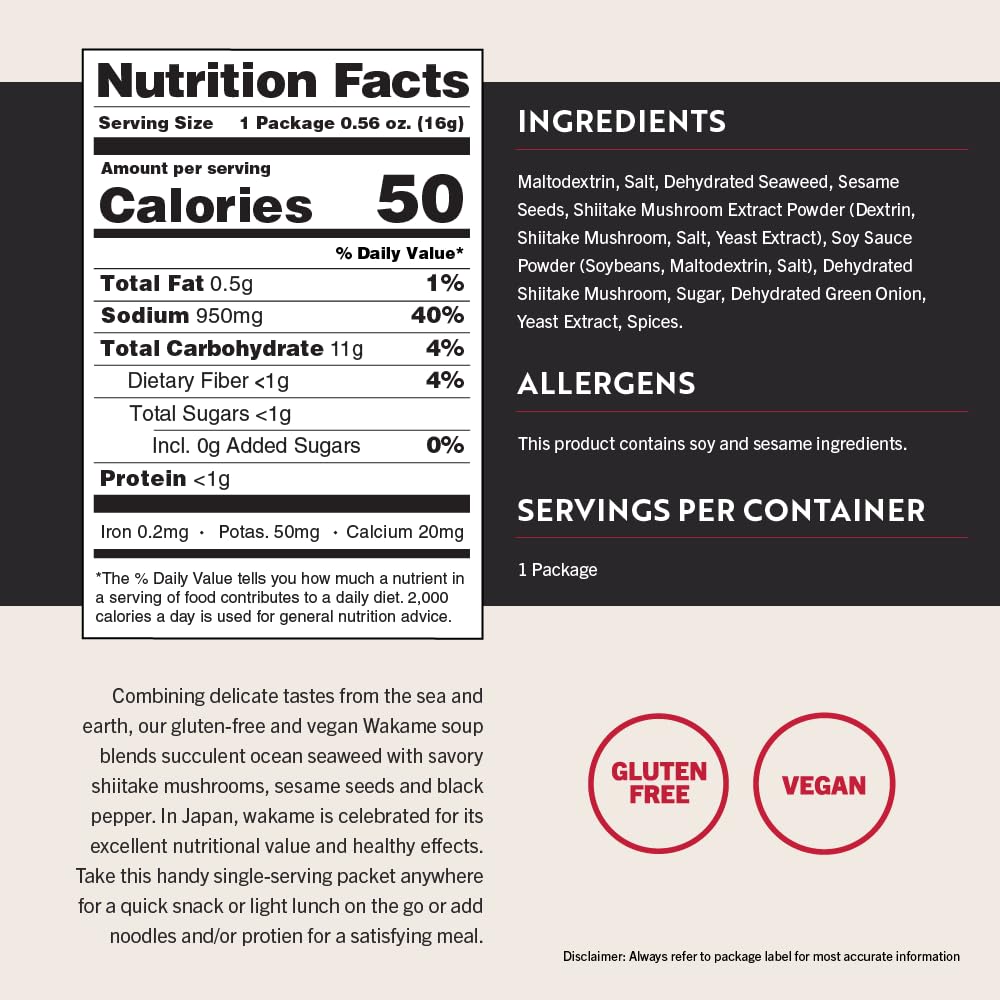 - ON THE GO: Take this handy single-serving packet anywhere for a quick snack or light lunch on the go and indulge in our gluten-free and vegan Wakame soup made from a blend of succulent ocean seaweed, savory shiitake mushrooms, sesame seeds & black pepper