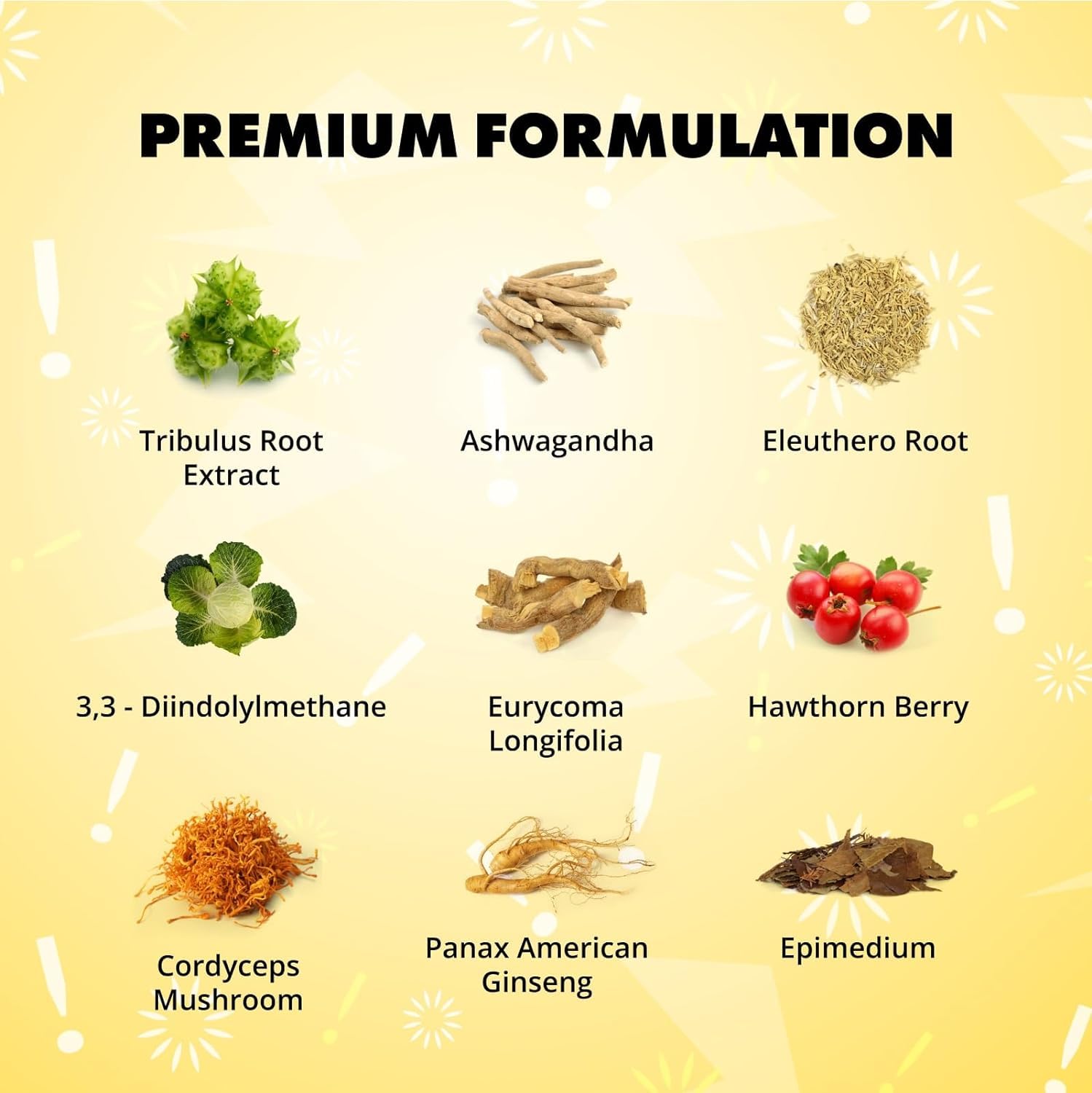 - Natural Formula for Men: Our testosterone booster is packed with Ashwagandha (KSM-66), Tribulus extract, American Ginseng Root, and other extracts to help support gains, energy and stamina.*