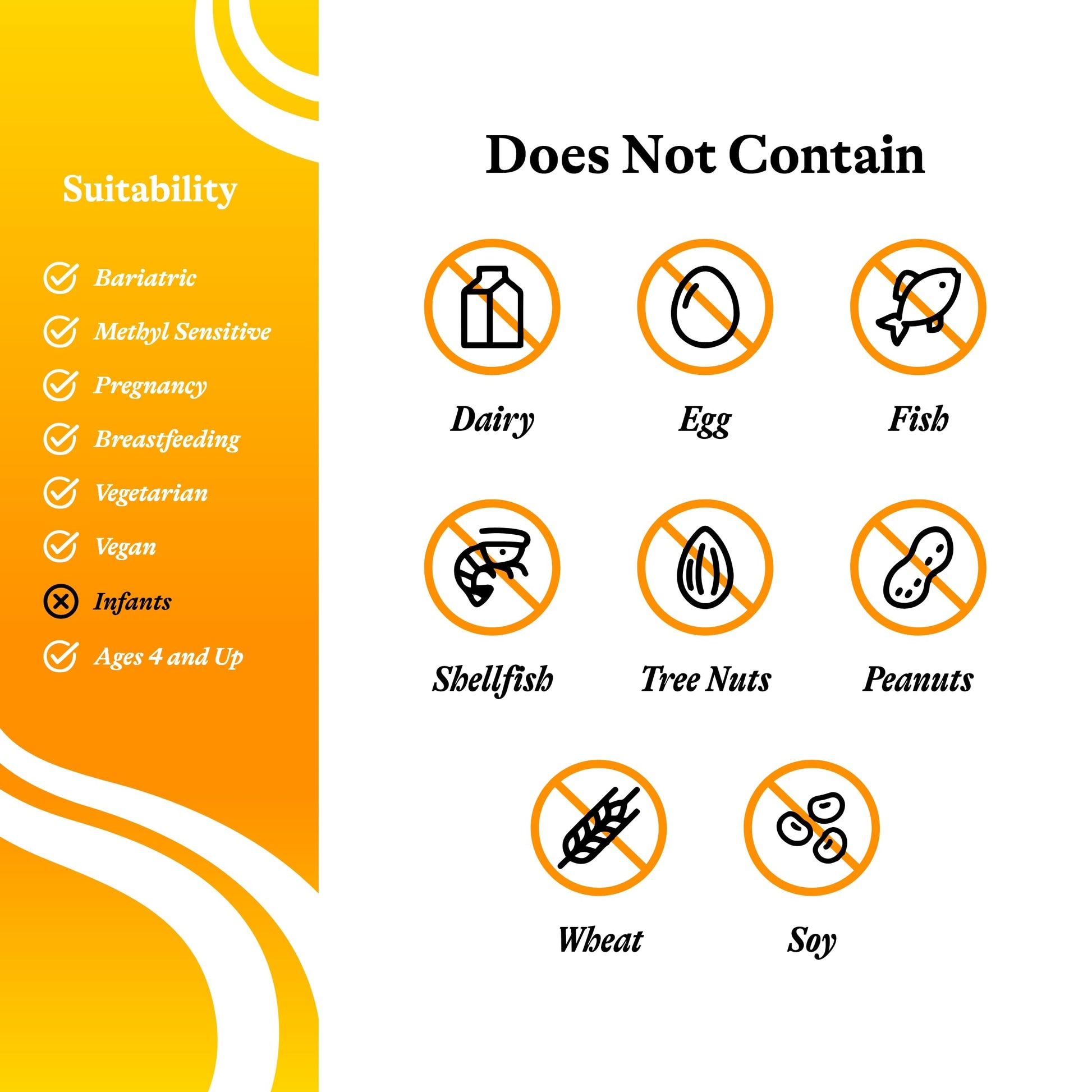 - Free from: Eggs, fish, gluten, GMO, milk, peanuts, shellfish, soy, tree nuts, wheat, artificial colors, artificial flavors, and artificial preservatives