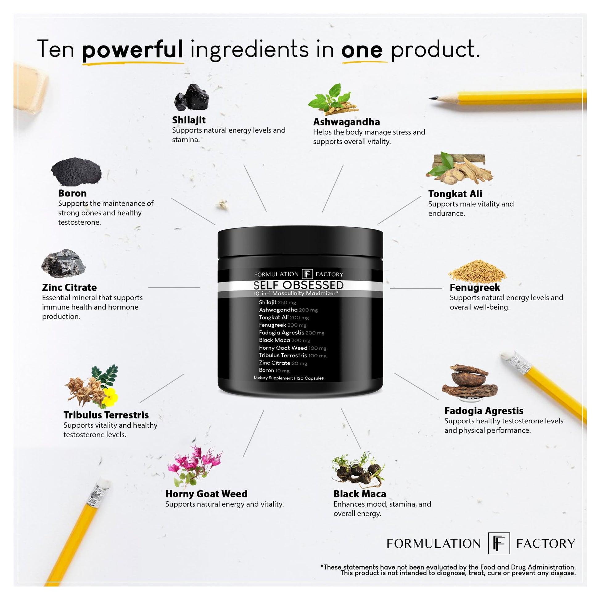 - [Boost Your Vitality] SELF OBSESSED is formulated with premium ingredients including Shilajit, Ashwagandha, Fadogia Agrestis, Tongkat Ali, Fenugreek, Black Maca, and more, designed to support men's vitality, stamina, and overall performance.