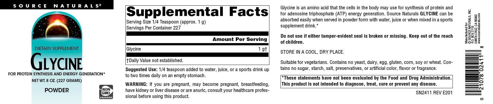 - Glycine is an amino acid that the cells in the body may use for synthesis of protein and for adenosine triphosphate (ATP) energy generation. Source Naturals Glycine Powder can be absorbed easily when served in powder form with water, juice or when mixed in a sports supplement drink.*
