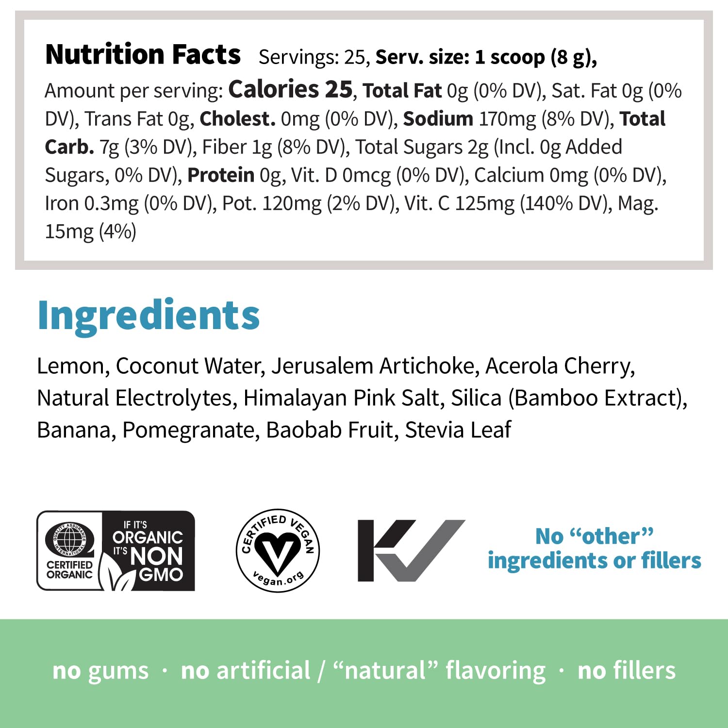 - WHOLE FOOD INGREDIENTS, NO FILLERS - We use real coconut water and Himalayan pink salt mixed with antioxidant-packed pomegranate, heirloom red banana, lemon, acerola and baobab fruit. No added sugars, dextrose, sucrose or anything synthetic or artificial.