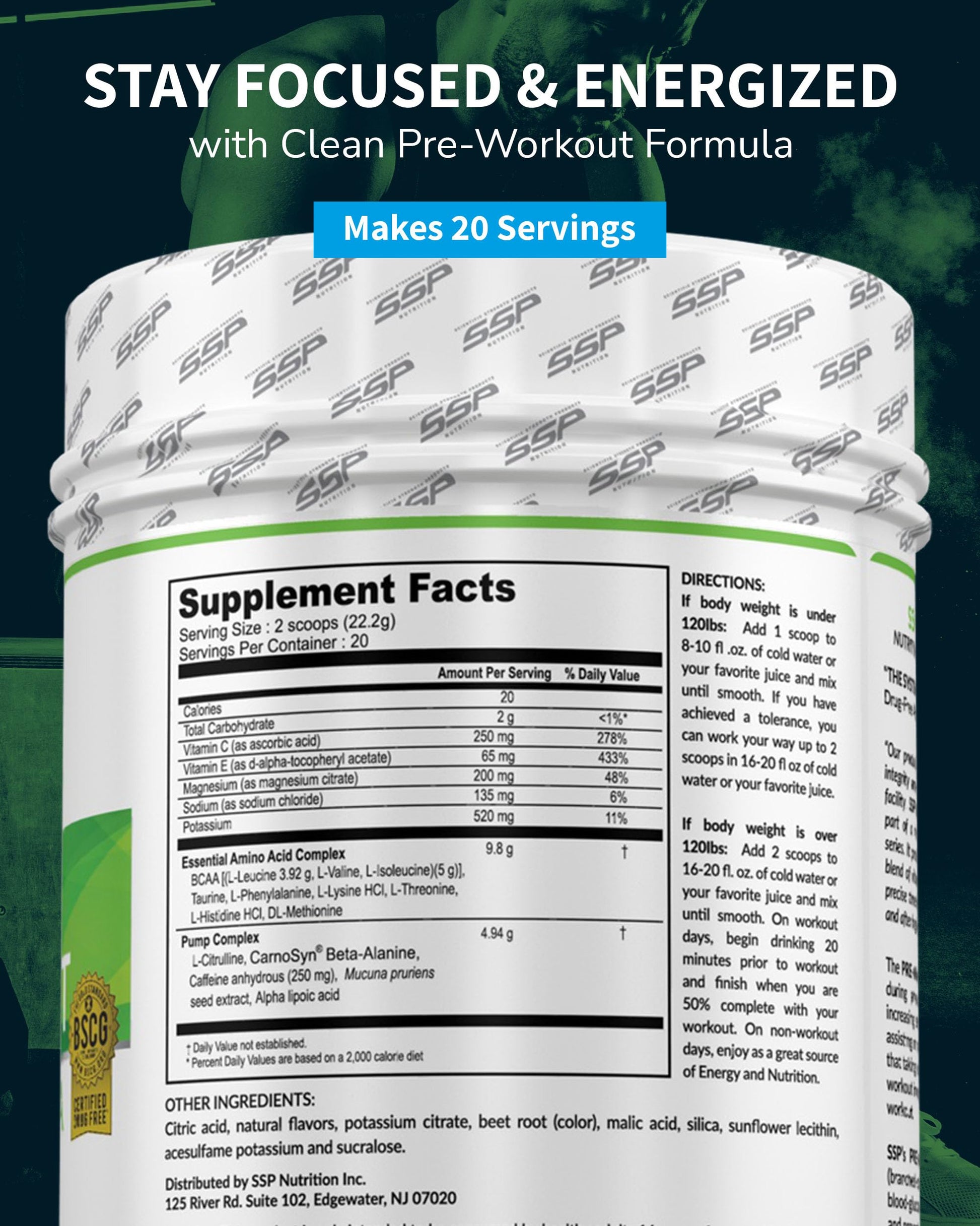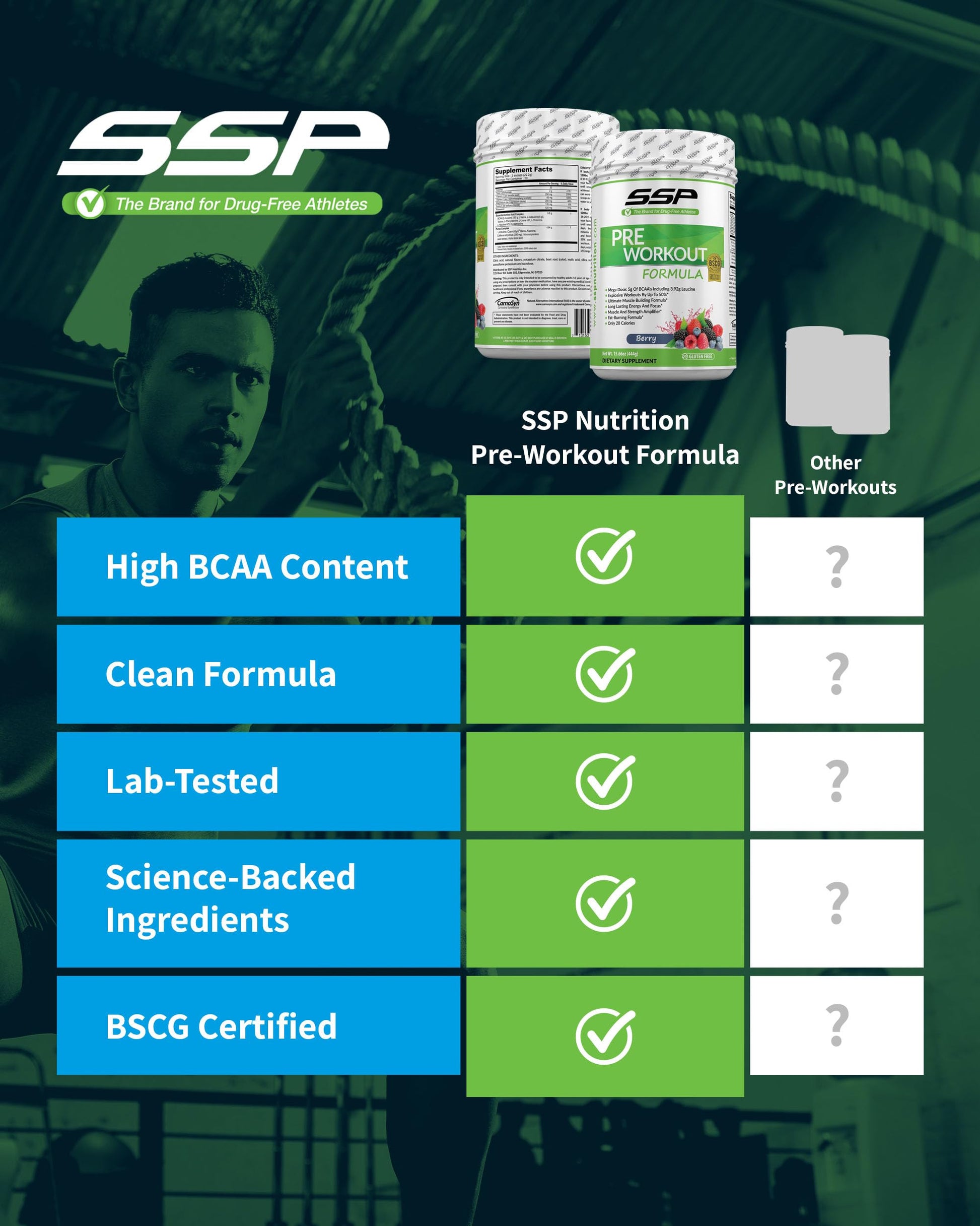 - Made for Athletes: SSP Nutrition’s natural pre-workout powder delivers clean energy, is built on science, and is formulated to meet BSCG standards. Our gym supplements provide athletes with trusted support for peak performance without unwanted additives.