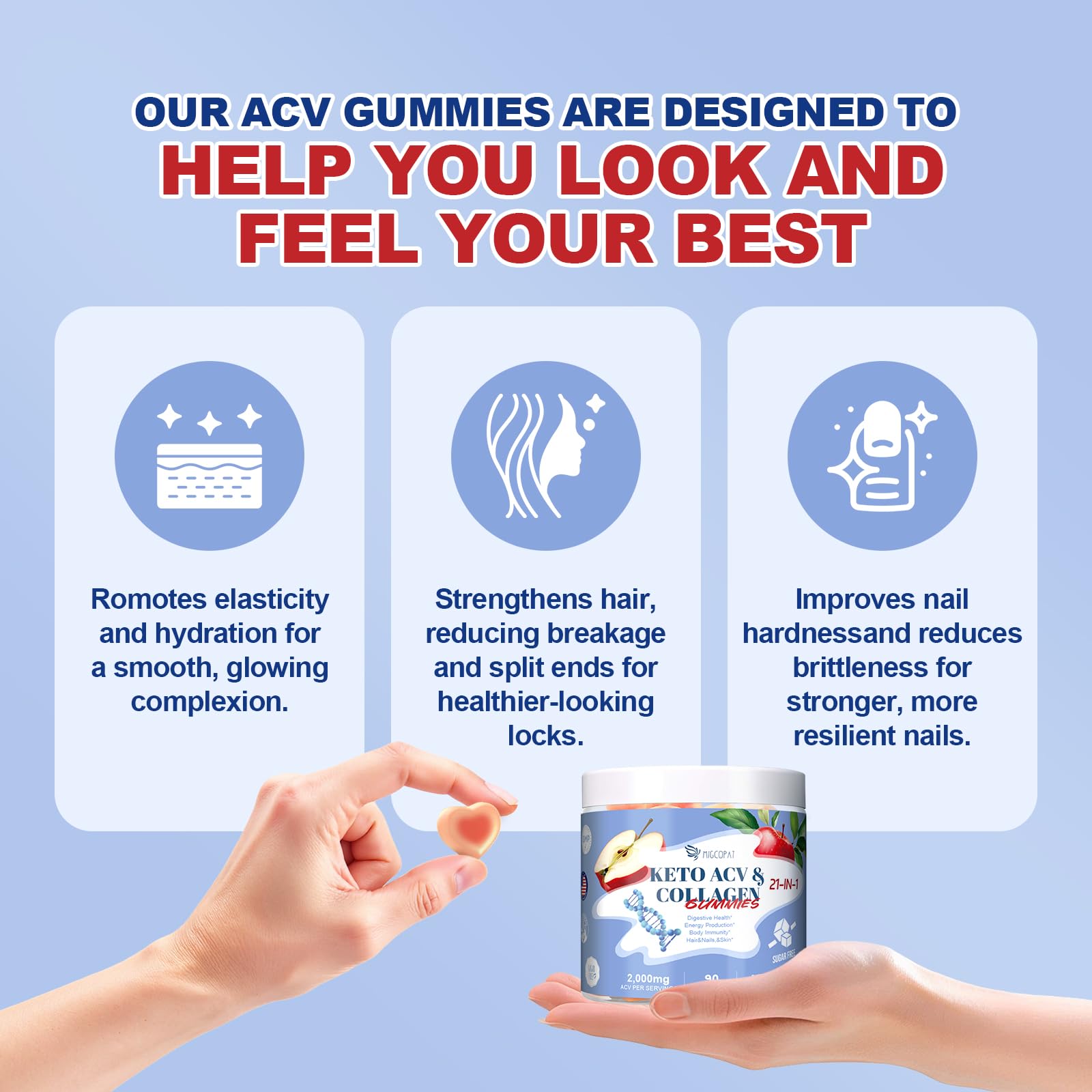 - A Decent Source of Collagen, Biotin and Vitamins : These keto ACV gummies contain a multi-collagen blend (Types I, II, III, V, X) along with 5000mg biotin and vitamins A, B, C, D3, and E. The 5000mg of Biotin plays a crucial role in supporting healthier hair, skin, and nails, while the combination of collagen and vitamins ensures maximum absorption.