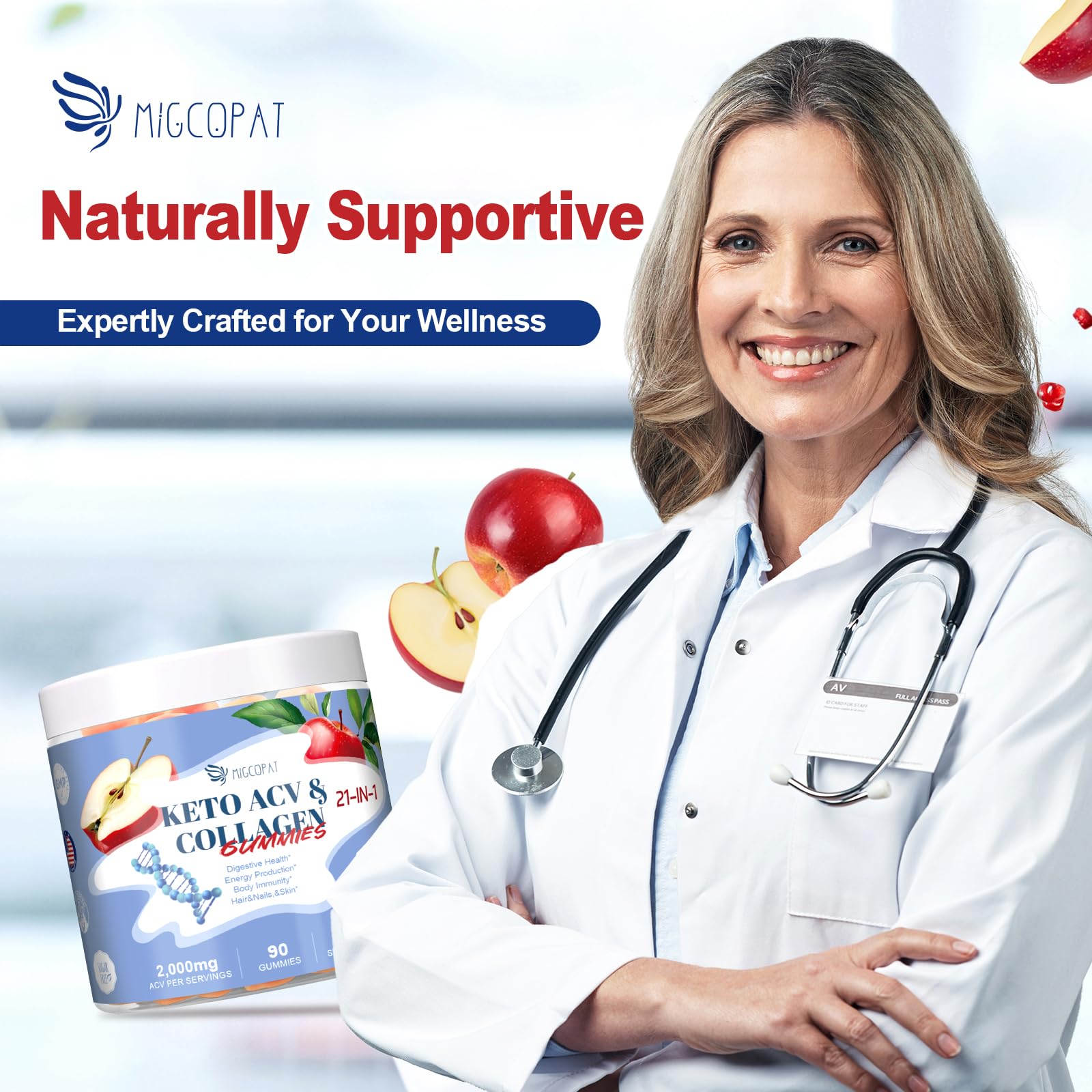 Sugar Free Apple Cider Vinegar Gummies, 21 in 1 Keto ACV Gummies with Multi Collagen Peptides, Biotin, Probiotics, Vitamins for Healthy Hair, Skin, Nails & Digestive Support, Apple Flavored, 90 Count