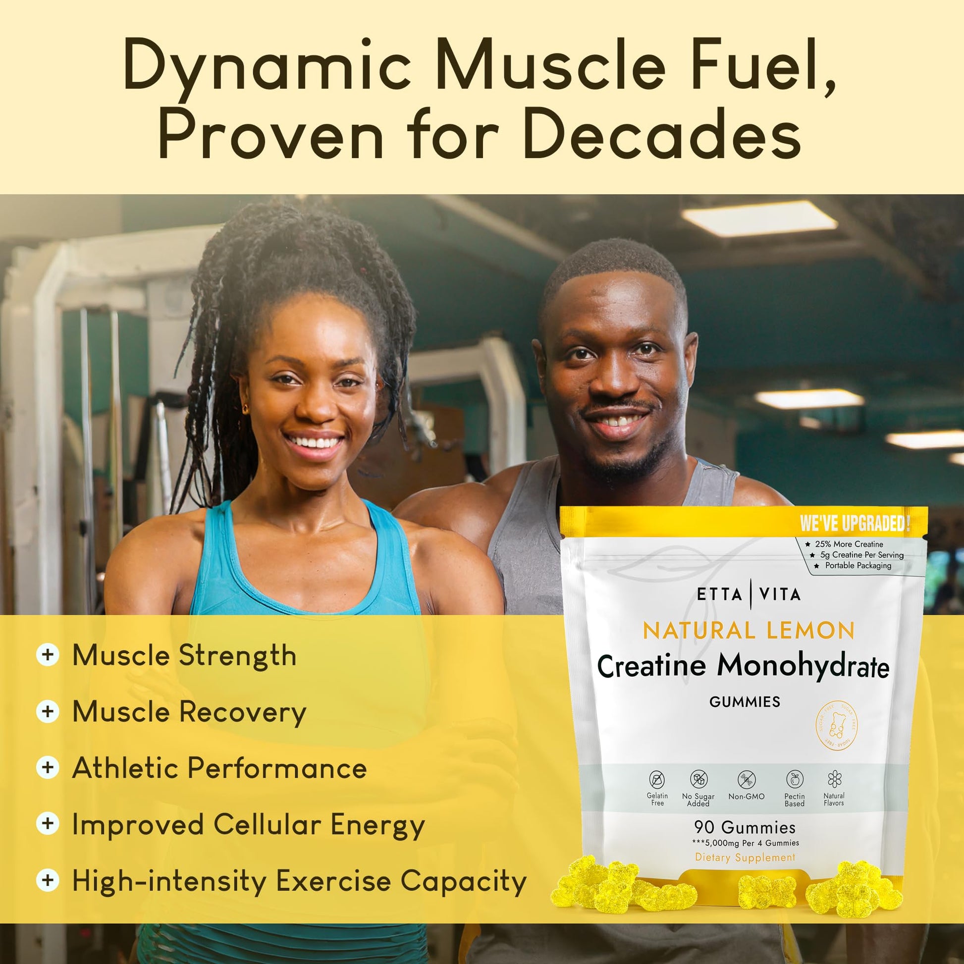 - [Efficient Muscle Fuel] Fuel your workouts like never before. Packed with potent creatine monohydrate, Etta Vita's creatine gummies help in promoting lean muscle growth, elevating athletic performance, improving high-intensity exercise capacity, enhancing muscle strength, and muscle recovery. These are effective creatine gummies for men and women.
