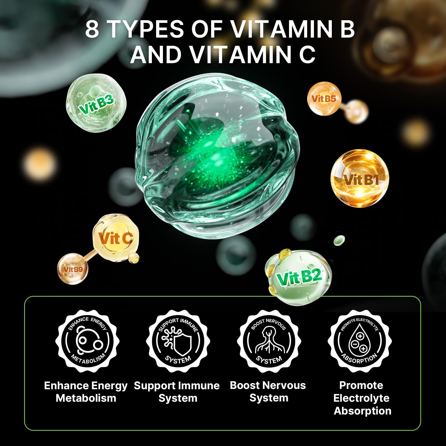 - Abundant in 8 Types of Vitamin B and Vitamin C: Energize your body and enhance your immune system with our formula abundant in nine types of Vitamin B (B1, B2, B3, B5, B6, B7, B9, B12) and Vitamin C. These vitamins are crucial for energy production, nerve function, and promoting collagen production, fostering overall well-being, vitality, and quicker recovery.