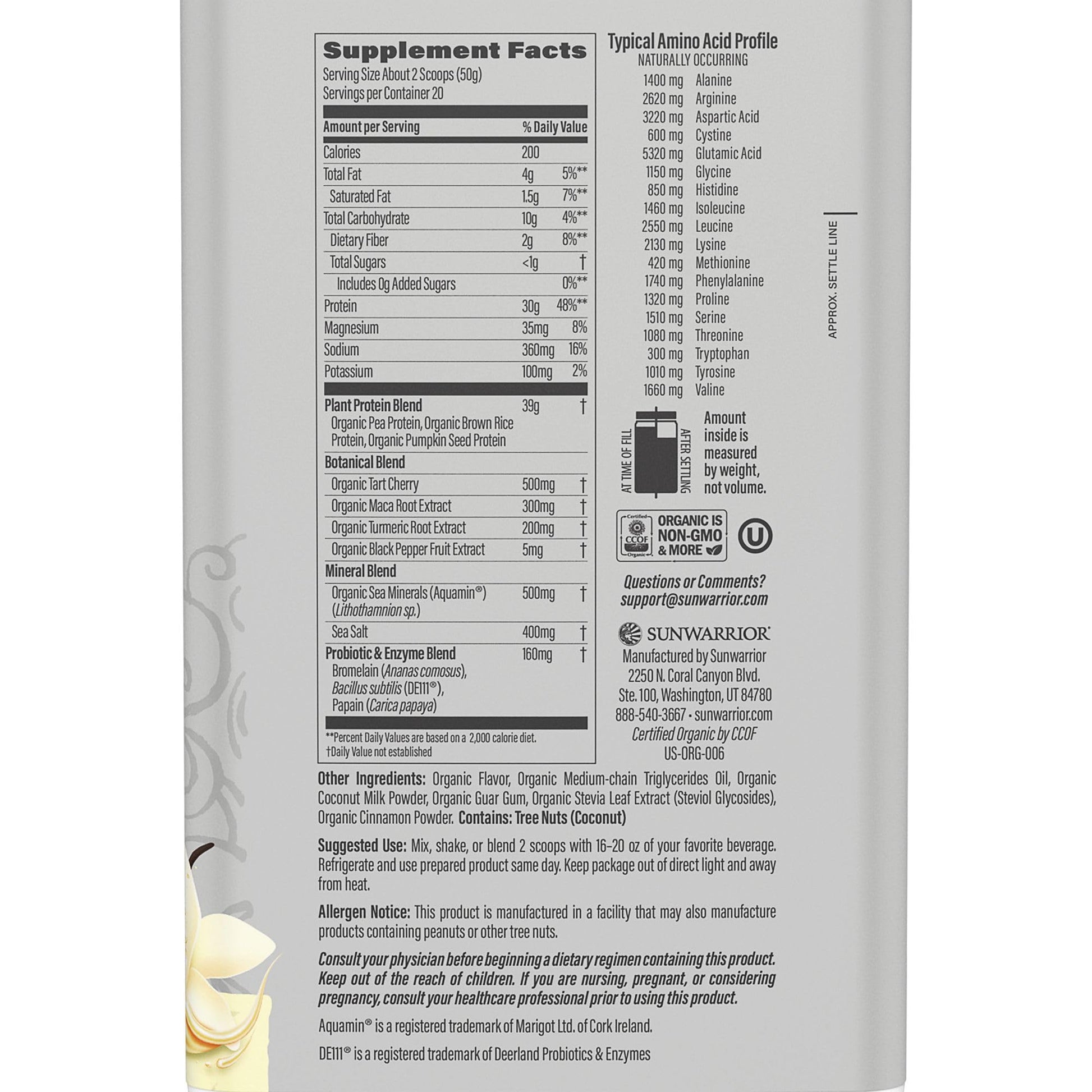 Sunwarrior Vegan Protein Powder Plant-Based USDA Organic BCAAs | Sugar, Gluten, Dairy Free Non-GMO | Vanilla Flavored 20 Servings | Sport Active