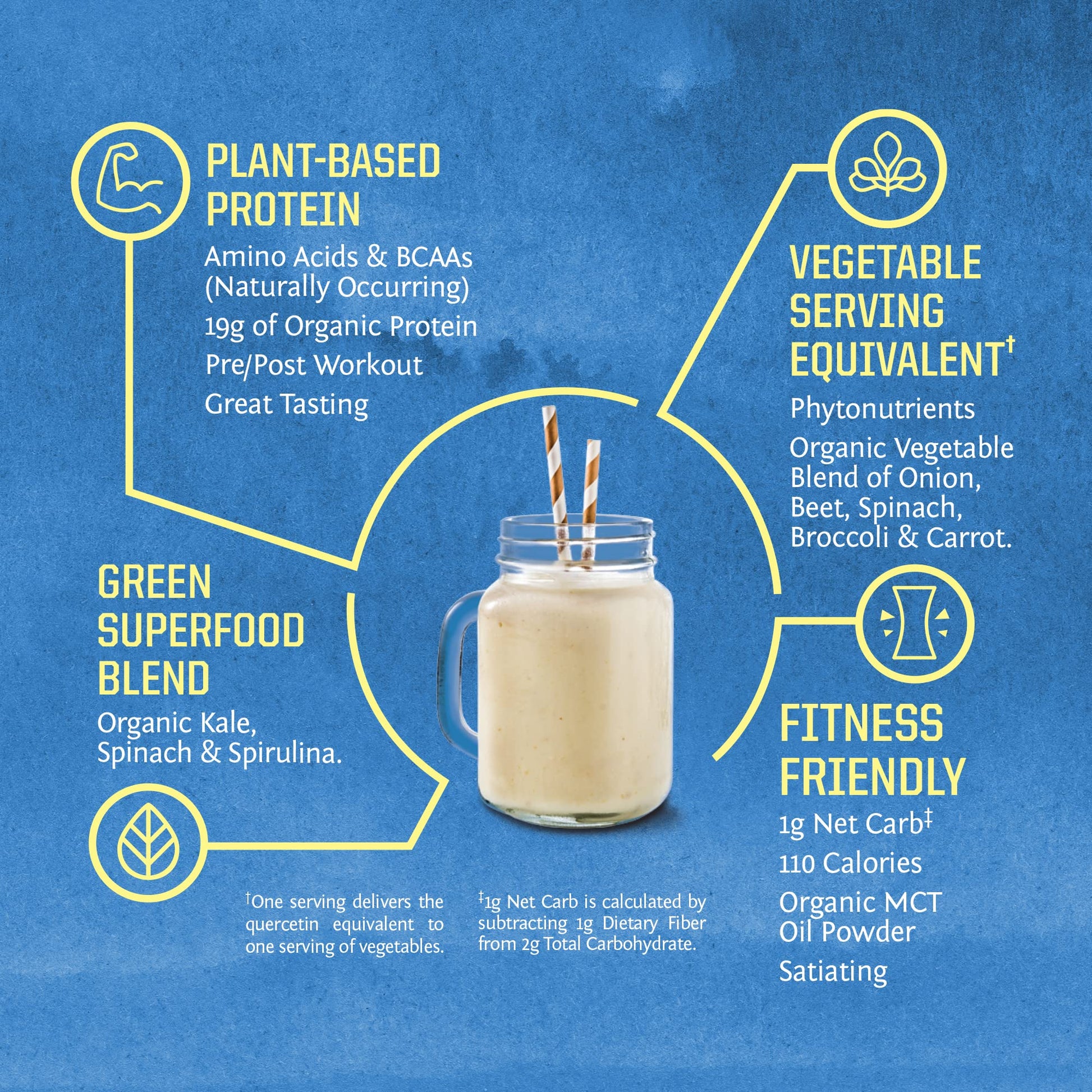 - Excellent source of premium organic super greens, 16g organic plant-based protein, Net carb friendly, 1 organic vegetable serving equivalent, Naturally occurring BCAAs