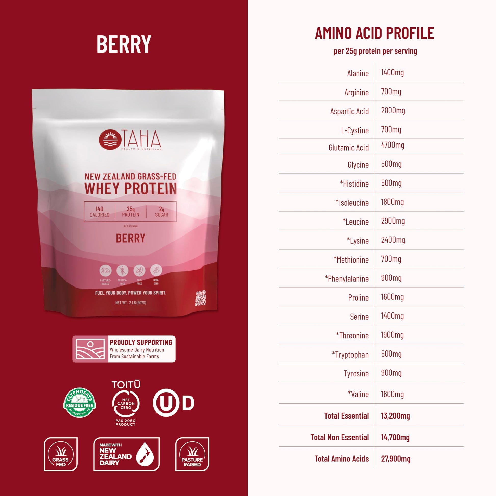 Taha Health & Nutrition Berry Flavored Whey Protein Concentrate Powder, 25g Protein, 140 Calories, 2g Sugar | New Zealand Grass-Fed, Free-Range Dairy | Gluten and Soy Free, Keto, Kosher | 2LB