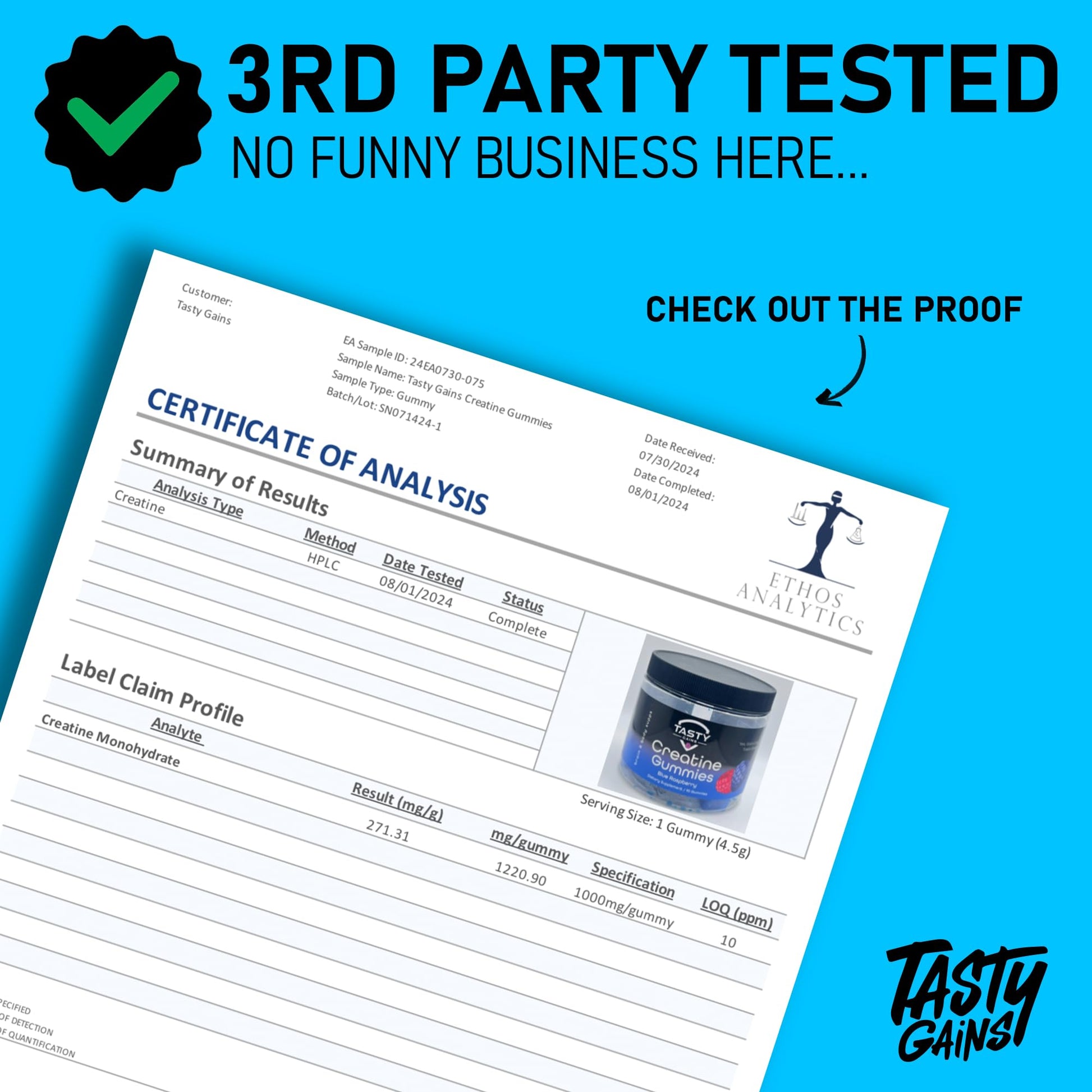 - Risk-Free Promise - Tasty Gains Creatine Gummies comes highly recommended by many, but the final judgment is yours. If you’re not completely satisfied, we’ll refund your entire order - no questions asked.