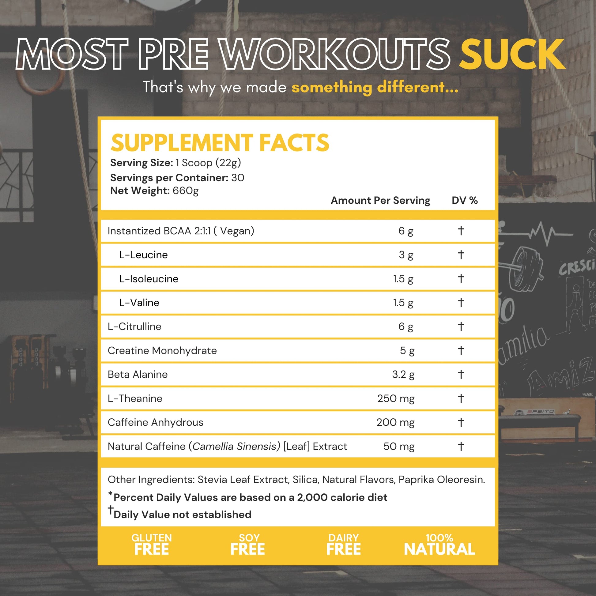 - 100% Natural Ingredients: You should actually know what goes into your body… This pre workout with creatine is loaded with clinically dosed, natural ingredients you need, and none of the fillers you don’t. With ingredients like Caffeine, Green Tea Leaf Extract, Beta Alanine, 5 grams of Creatine Monohydrate, 6 grams of L-Citrulline Malate, L-Theanine, and BCAA’s, you’re ready to shake of the early morning cobwebs and get to work.