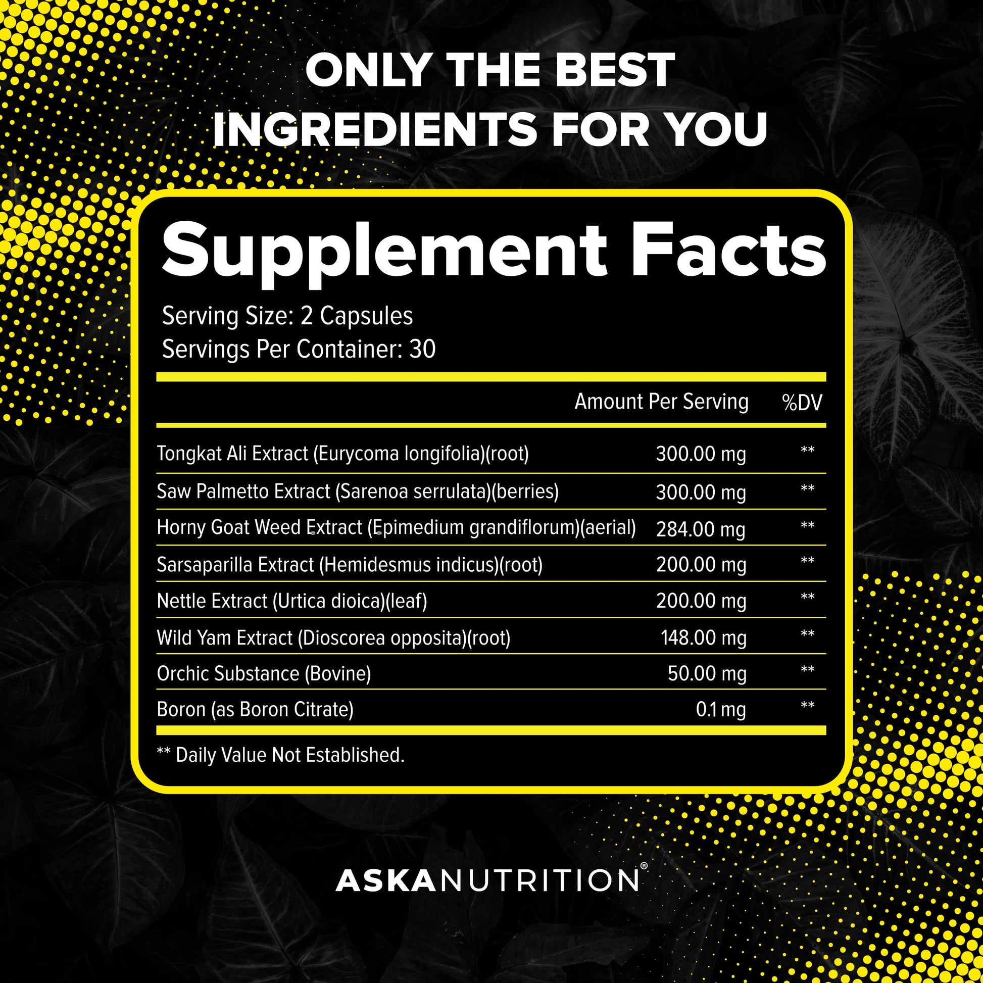 - Testosterone Booster - Experience ASKA Nutrition's elite testosterone supplement, featuring a potent mix of time-tested natural extracts including Tongkat Ali (Eurycoma longifolia), designed to elevate energy, stamina, strength, libido, and support lean muscle development.