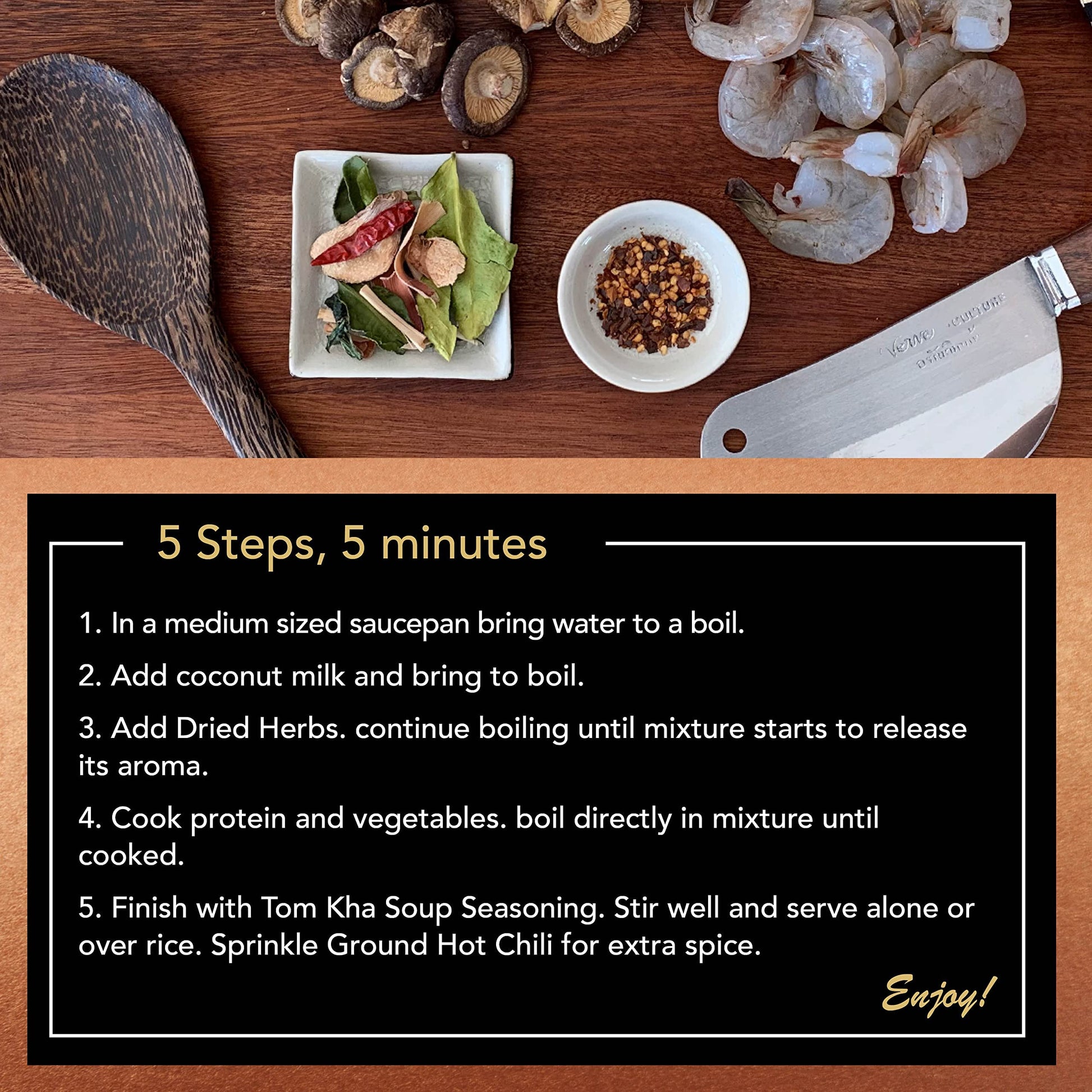 - VERSATILE & DELICIOUS Create your own Tom Kha Soup, with our Thai for Two Cooking Kit • With Thai flavors like lemongrass, kaffir lime, and of course, coconut milk, just add your own protein and vegetables, and enjoy • A traditional Thai coconut soup, its a creamy, flavorful, savory soup thats a go-to for cold and flu season, or anytime you want a bowl of comfort!
