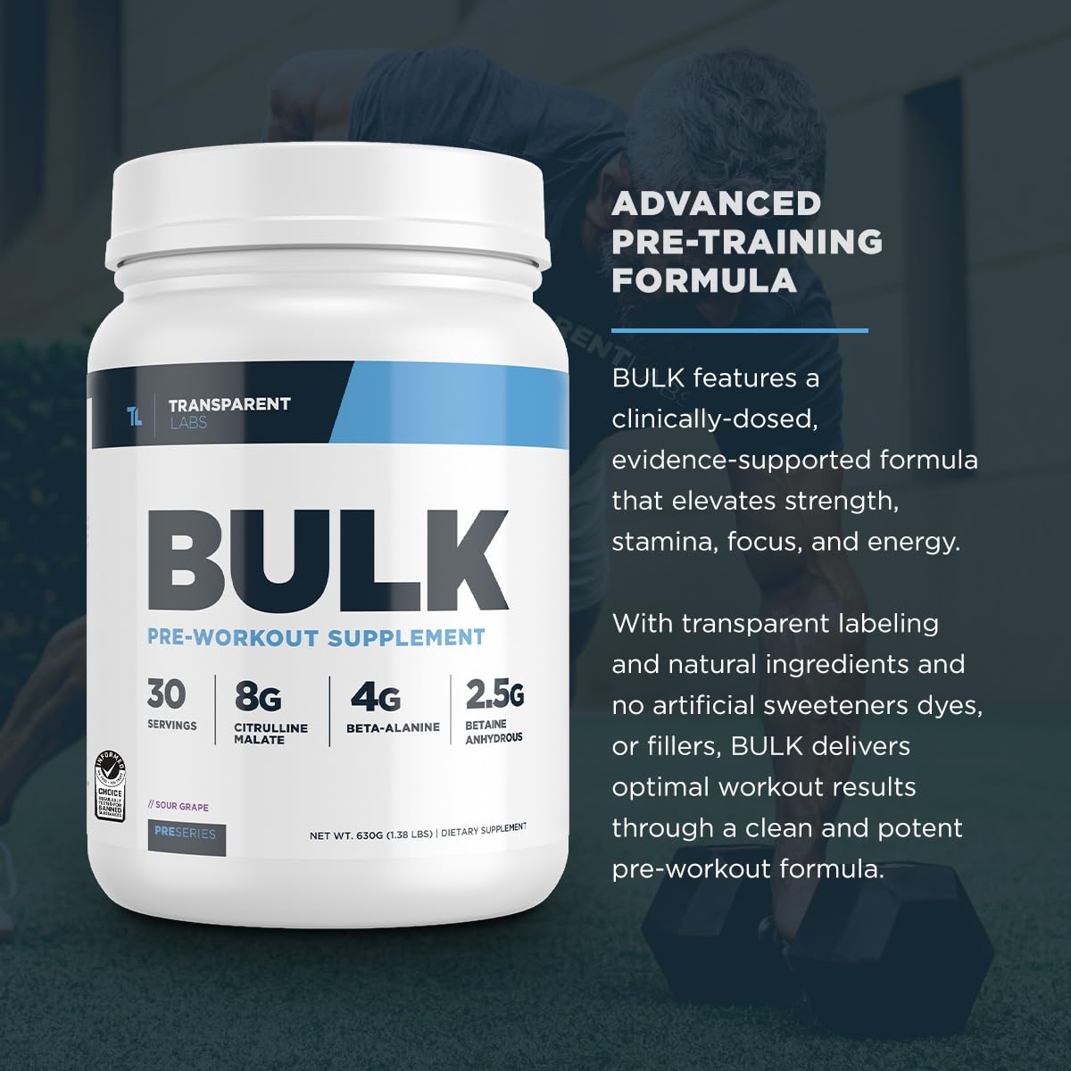 - Enhanced Performance: Transparent Labs Bulk Pre-workout isn't just another energy booster. It's a comprehensive performance enhancer. With a combination of ingredients tailored to enhance strength, increase muscle pumps, boost stamina, sharpen focus, and provide sustained energy, Bulk empowers you to take charge of your workouts. Whether you're aiming to set new personal records or achieve lean muscle growth, Bulk is your trusted partner on your fitness path.