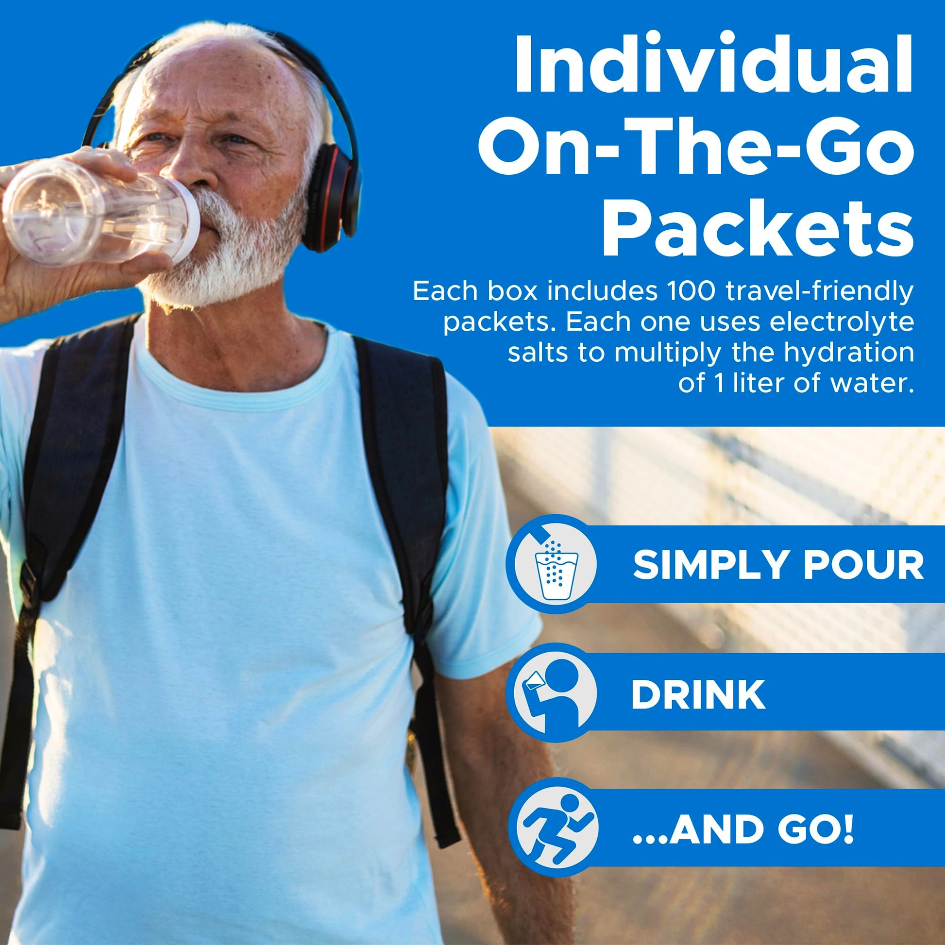 - INDIVIDUAL, ON-THE-GO PACKETS: Each box includes 100 travel-friendly packets. Each one uses electrolyte salts to multiply the hydration of 1 liter of water. Simply pour one into your water to create a powerful hydrating solution. Perfect for daily use at the gym, during travel, or in your first aid kit. Convenient and essential for staying hydrated anywhere.