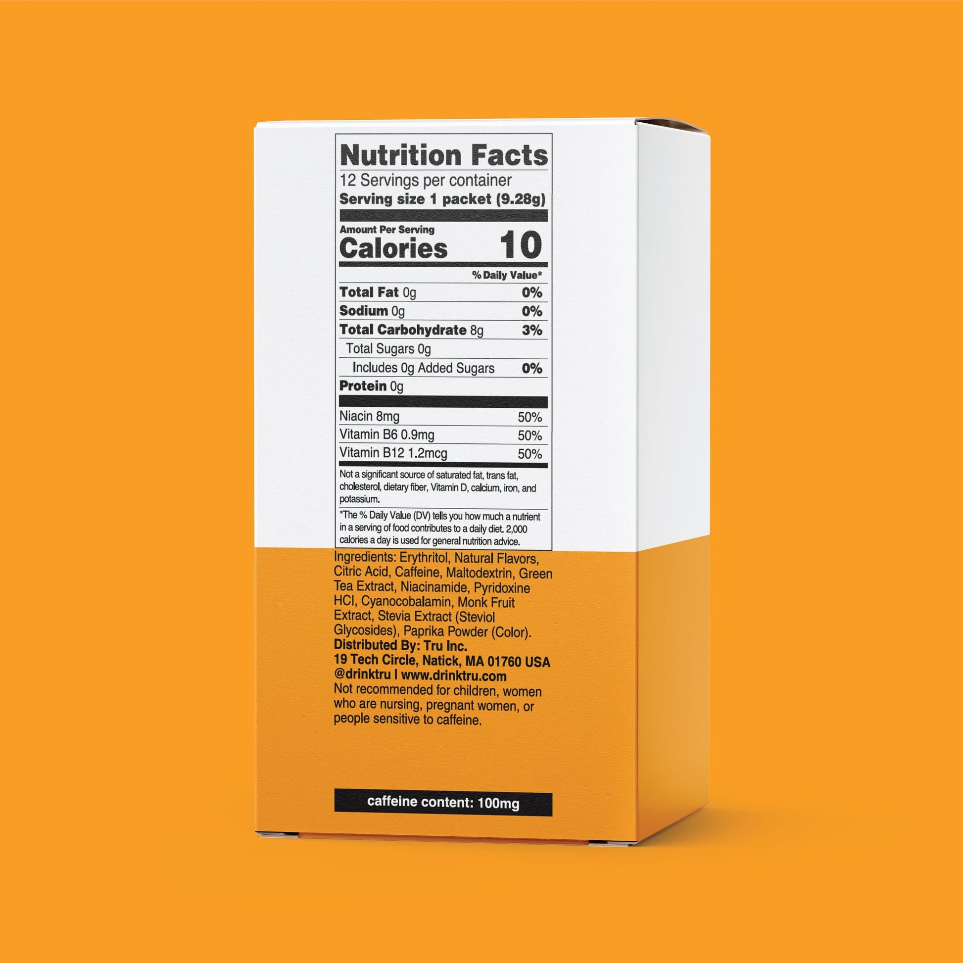 - ENERGY POWDER - Blended with green tea extract, natural caffeine, and B vitamins, Tru Energy Powder is a caffeinated energy dust. Often enjoyed as a clean energy drink, Tru offers hours of energy in a naturally flavored orange mango powdered supplement. Just add water.