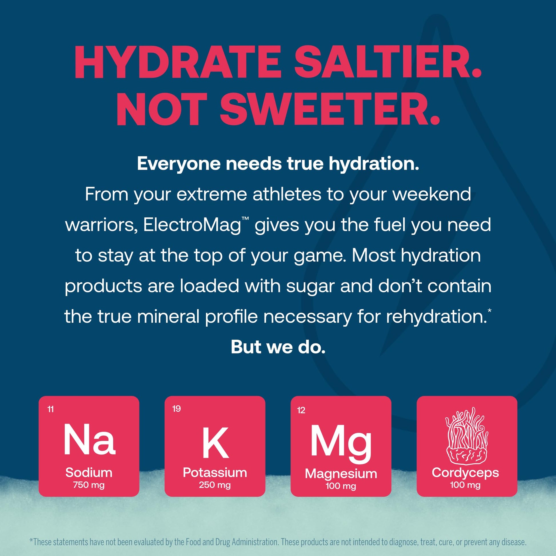 - TRUE DIFFERENCE - ElectroMag is crafted with intention using carefully sourced ingredients. Contains 750 mg sodium, 1390 mg chloride, 250 mg potassium & 100 mg magnesium for essential minerals; 100 mg fruiting body cordyceps mushroom for endurance.