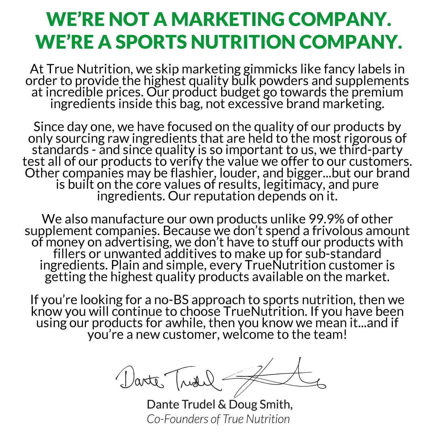 - PREMIUM QUALITY. FANTASTIC VALUE. True Nutrition was established on the values of our customers, not the owner’s wallets. True Nutrition absolutely refuses to cut any corners when it comes to product quality, product validity and product manufacturing