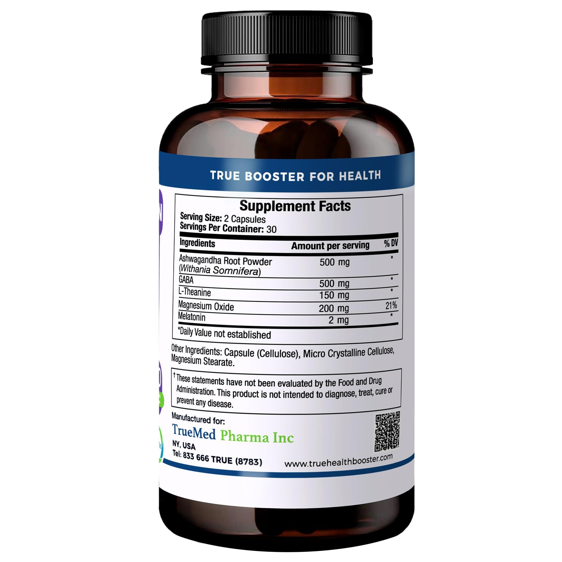 TrueMed Calmer Mind Nootropic Ashwagandha, GABA, L-Theanine, Magnesium & Melatonin - Supports Focus, Productivity, Creativity & Cognitive Function - Calmness & Mood Support - 60 Vegetable Capsules