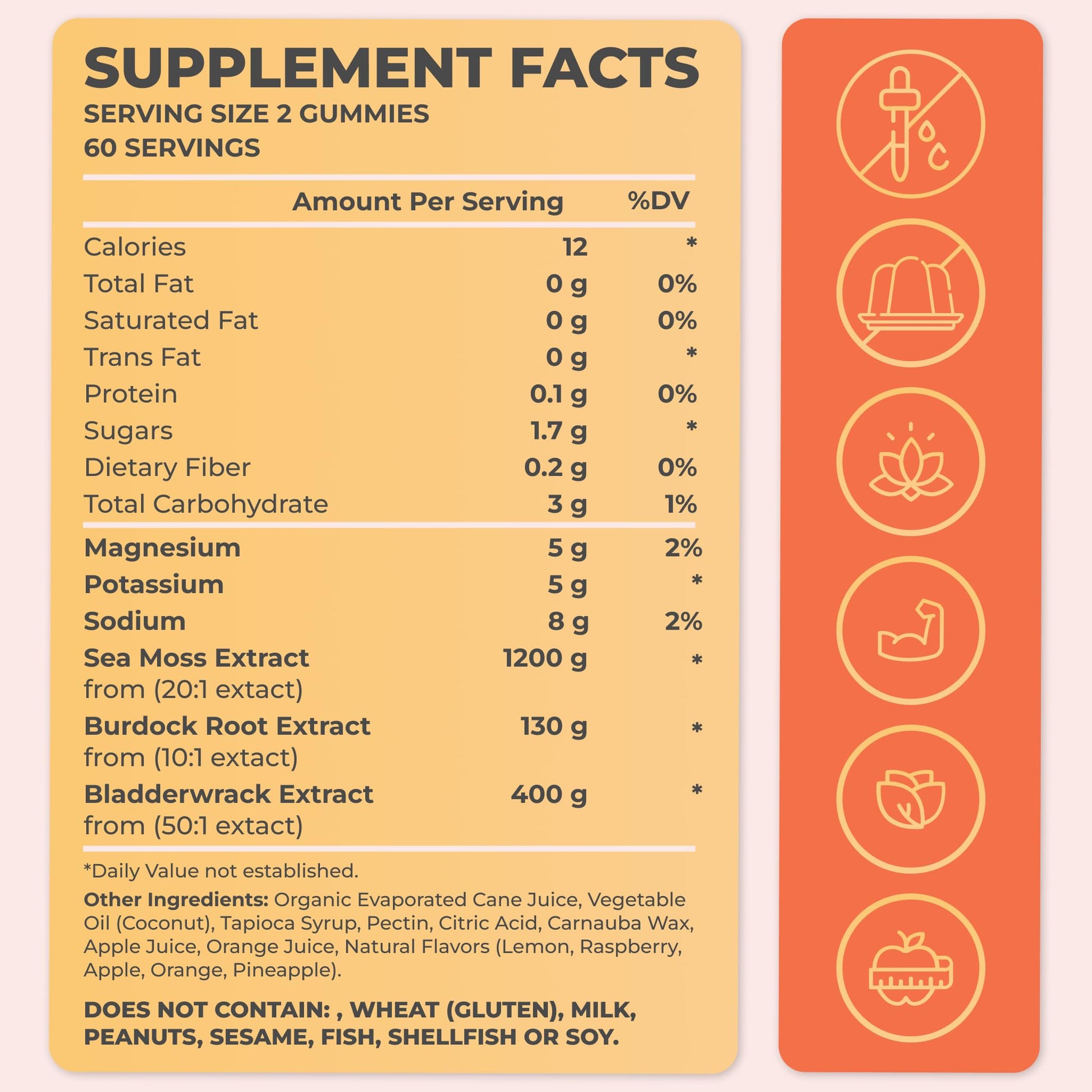 - SUPERIOR SUPERFOOD GOODNESS: TrueSeaMoss gummies deliver the powerful benefits of wildcrafted Irish Sea Moss, Burdock Root, and Bladderwrack, each gummy providing 1200 mg of Irish Sea Moss, 130 mg of Burdock Root, and 400 mg of Bladderwrack for natural wellness support.
