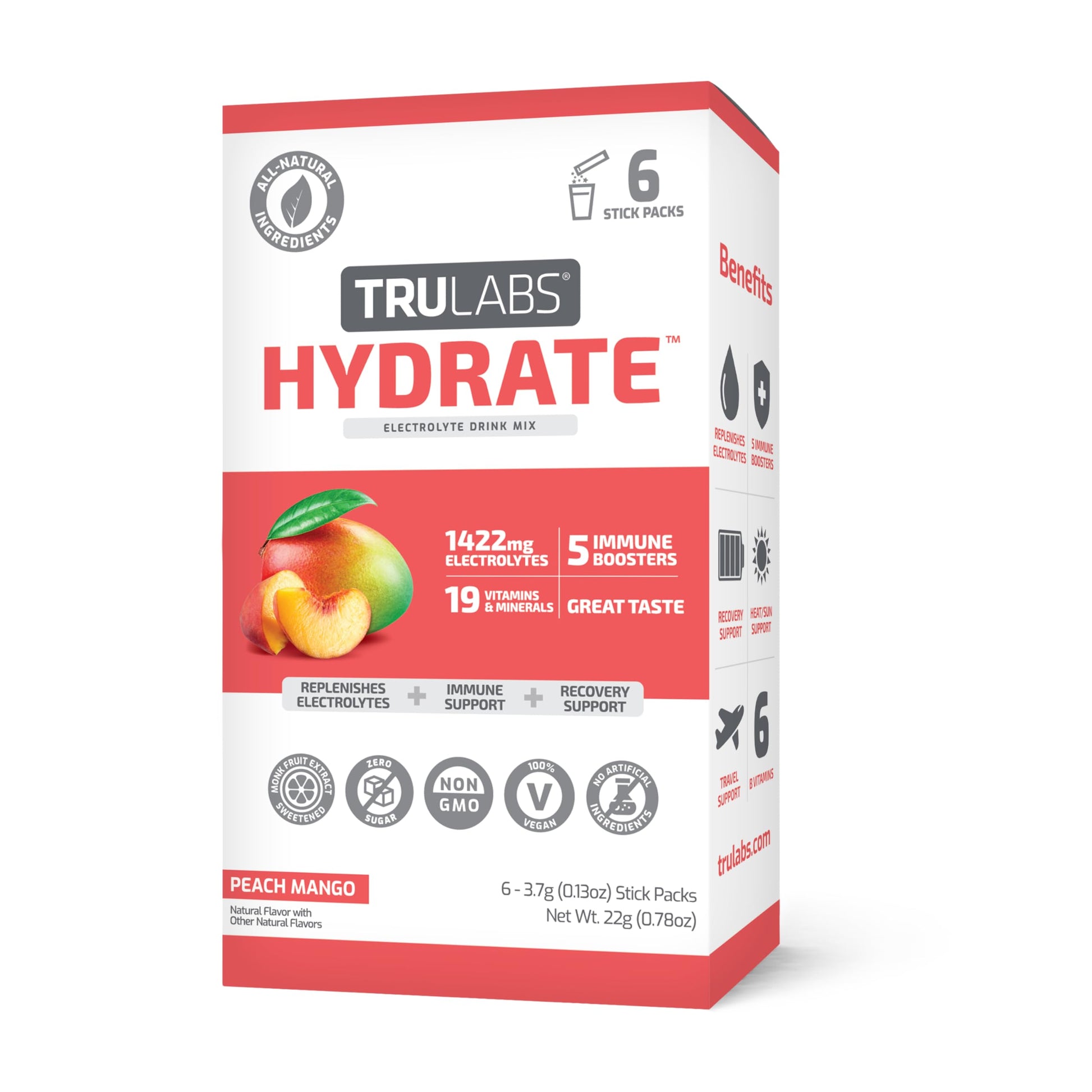 TRULABS Hydrate Peach Mango 6ct. Sugar Free Electrolytes Hydration Packets. Each Serving Contains 1422 mg of Electrolytes &19 Vitamins & Minerals.