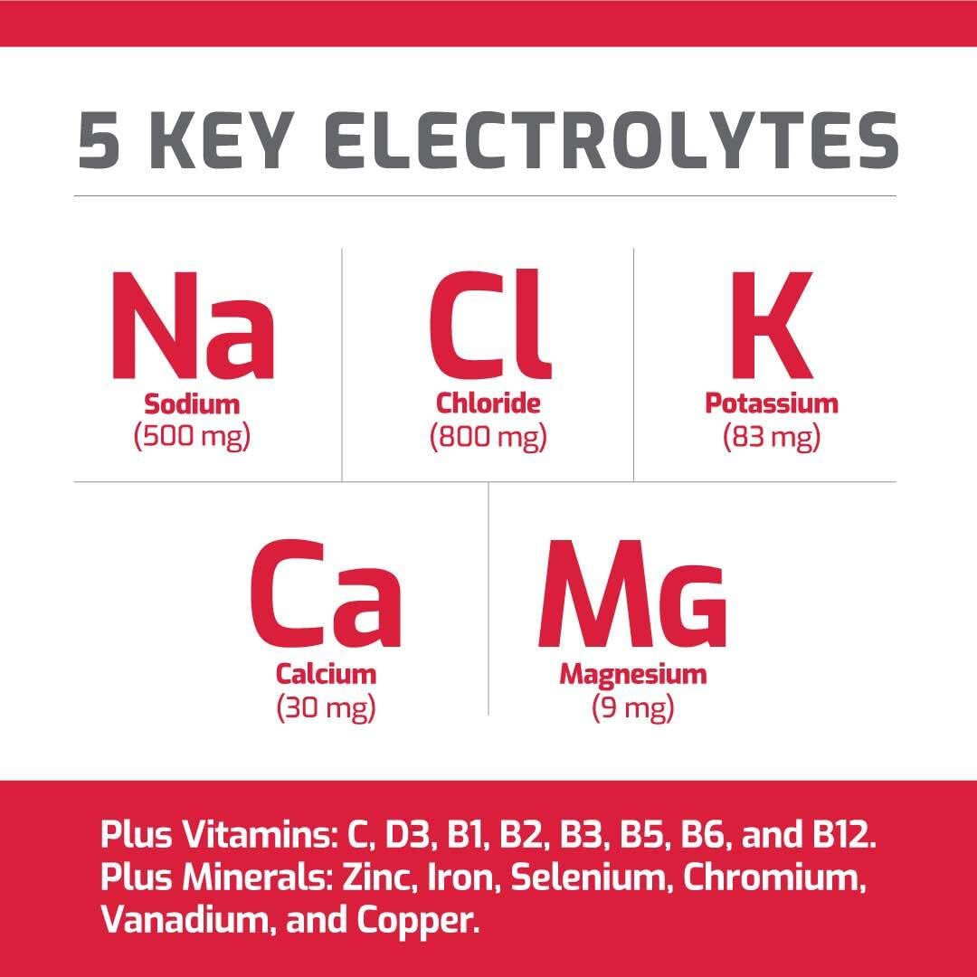 - HYDRATION: Our electrolytes drink mix contains: Sodium (500 mg), Chloride (800 mg), Potassium (83 mg), Calcium (30 mg), & Magnesium (9 mg) & includes 19 Vitamins & Minerals with six B Vitamins: B1, B2, B3, B5, B6, and B12.