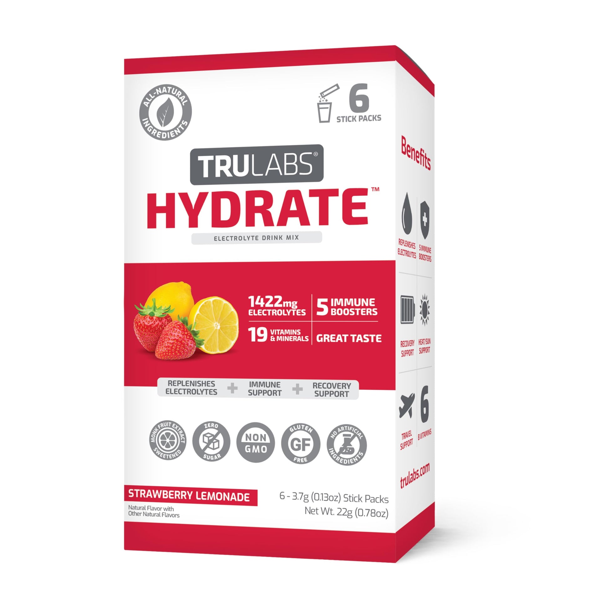 TRULABS Hydrate Strawberry Lemonade 6ct. Sugar Free Electrolytes Hydration Packets. Each Serving Contains 1422 mg of Electrolytes &19 Vitamins & Minerals.