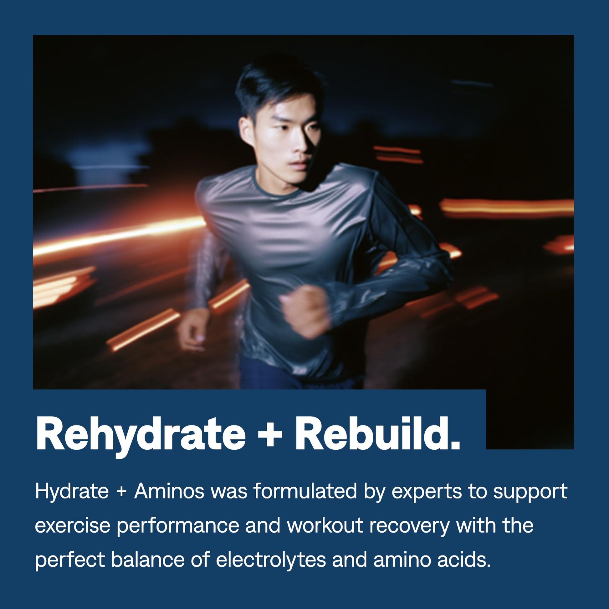 - DEHYDRATION RELIEF: Packed with 5 essential electrolytes to help improve workout performance by replacing what your body loses in sweat, Hydrate + Aminos helps you beat dehydration and enjoy better performance.