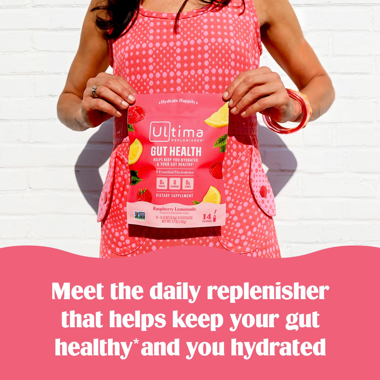 Ultima Replenisher Gut Health Supplement and Electrolytes Powder - Raspberry Lemonade, 14 Stickpacks - Hydration Packets with Added Gut Health Benefits