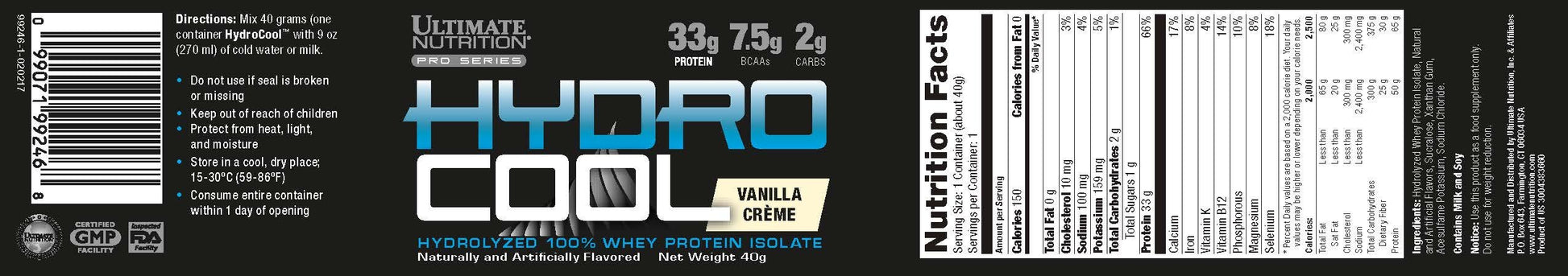 Ultimate Nutrition HydroCool 100% Whey Protein Isolate Powder - 33g Protein, 7.5g BCAAs, No Fat or Gluten (Vanilla, 40g Sample Size)